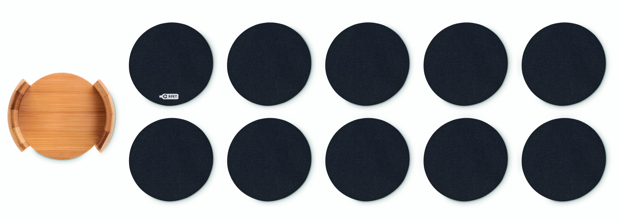 10 RPET lasinalusta bambu kotelossa. Luonnollisen materiaalin (bambu) vuoksi, tuotteiden värissä/ koossa saattaa olla erinäisyyksiä ja tämä voi vaikuttaa painatuksen lopputulokseen.