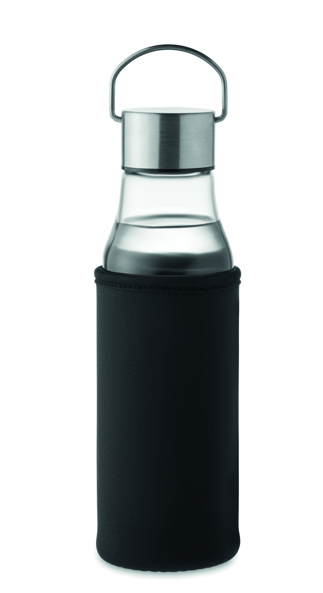 Lasipullo, jossa on ruostumattomasta teräksestä valmistettu kahvallinen kansi. Vuotamaton. Tilavuus: 500 ml.
