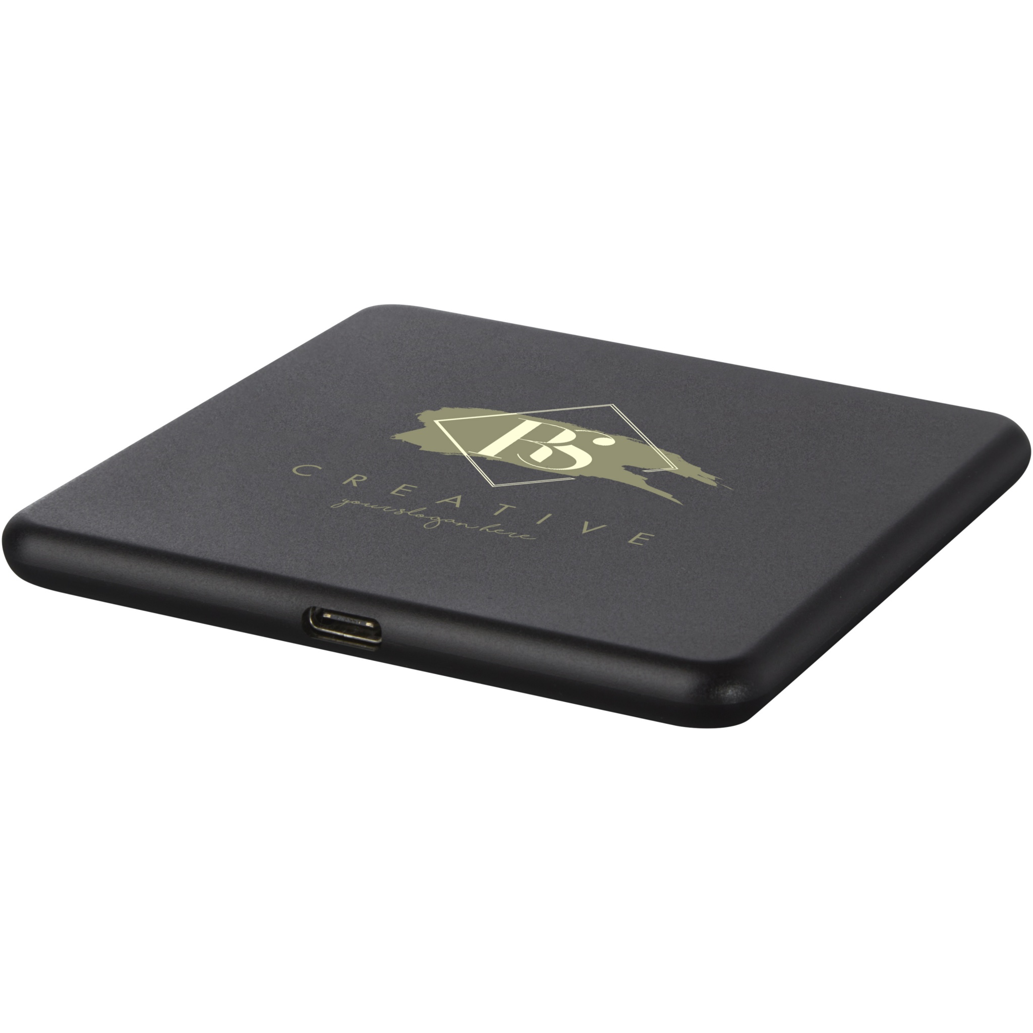 Langaton latausalusta, joka on valmistettu kierrätetystä ABS-muovista. Latausalusta liitetään tietokoneeseen tai kannettavaan tietokoneeseen, ja se lataa sen päälle asetettua laitetta. 10 W:n (maksimi) langaton teho mahdollistaa nopean latauksen. Yhteensopiva kaikkien Qi-laitteiden kanssa (iPhone 8 tai uudempi ja Android-laitteet, jotka tukevat langatonta latausta). Toimitetaan lahjapakkauksessa, joka sisältää käyttöohjeet (molemmat kestävistä materiaaleista).