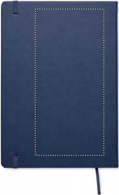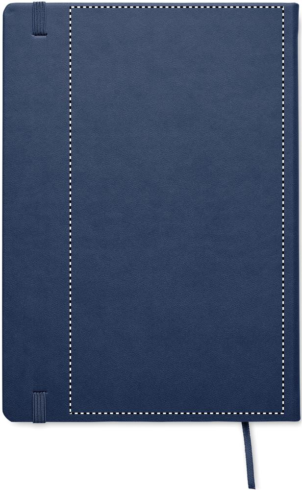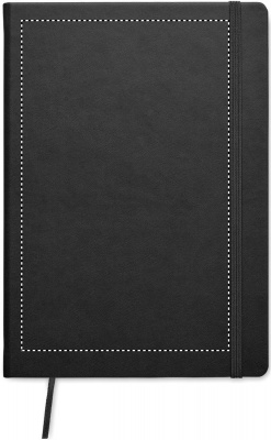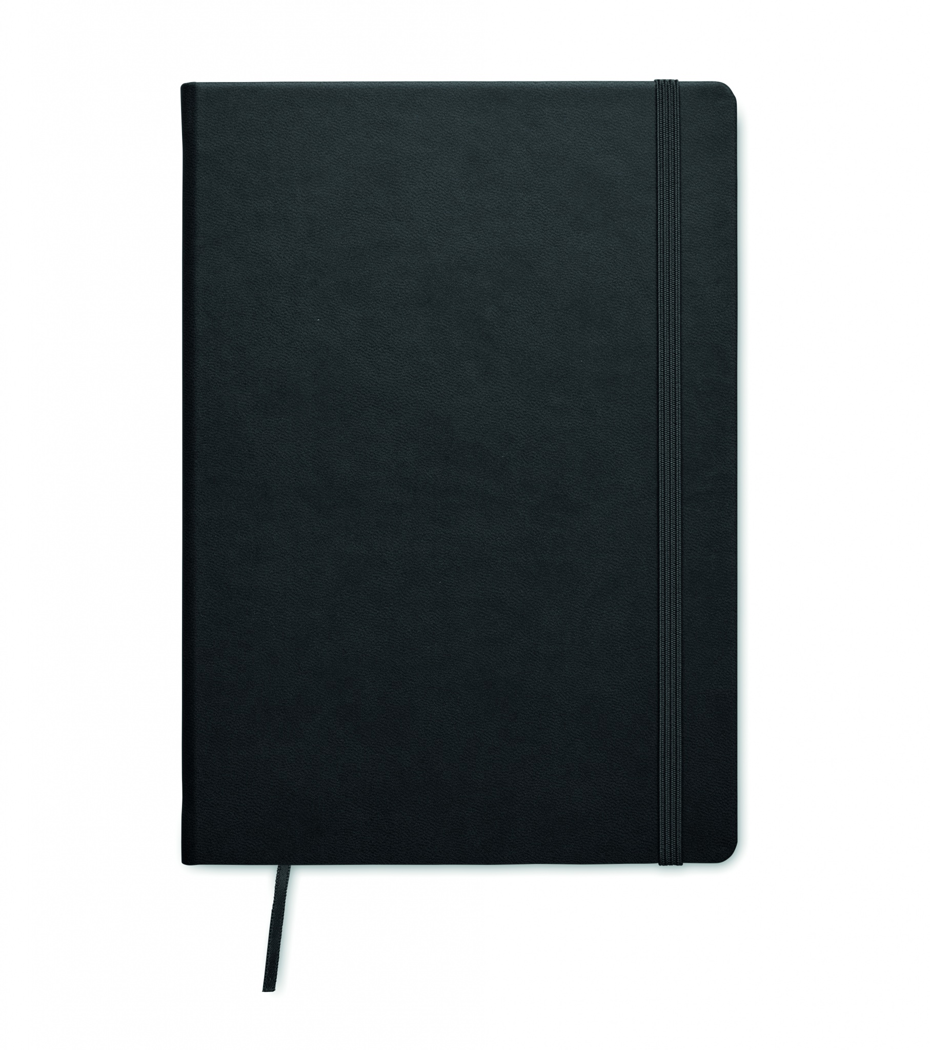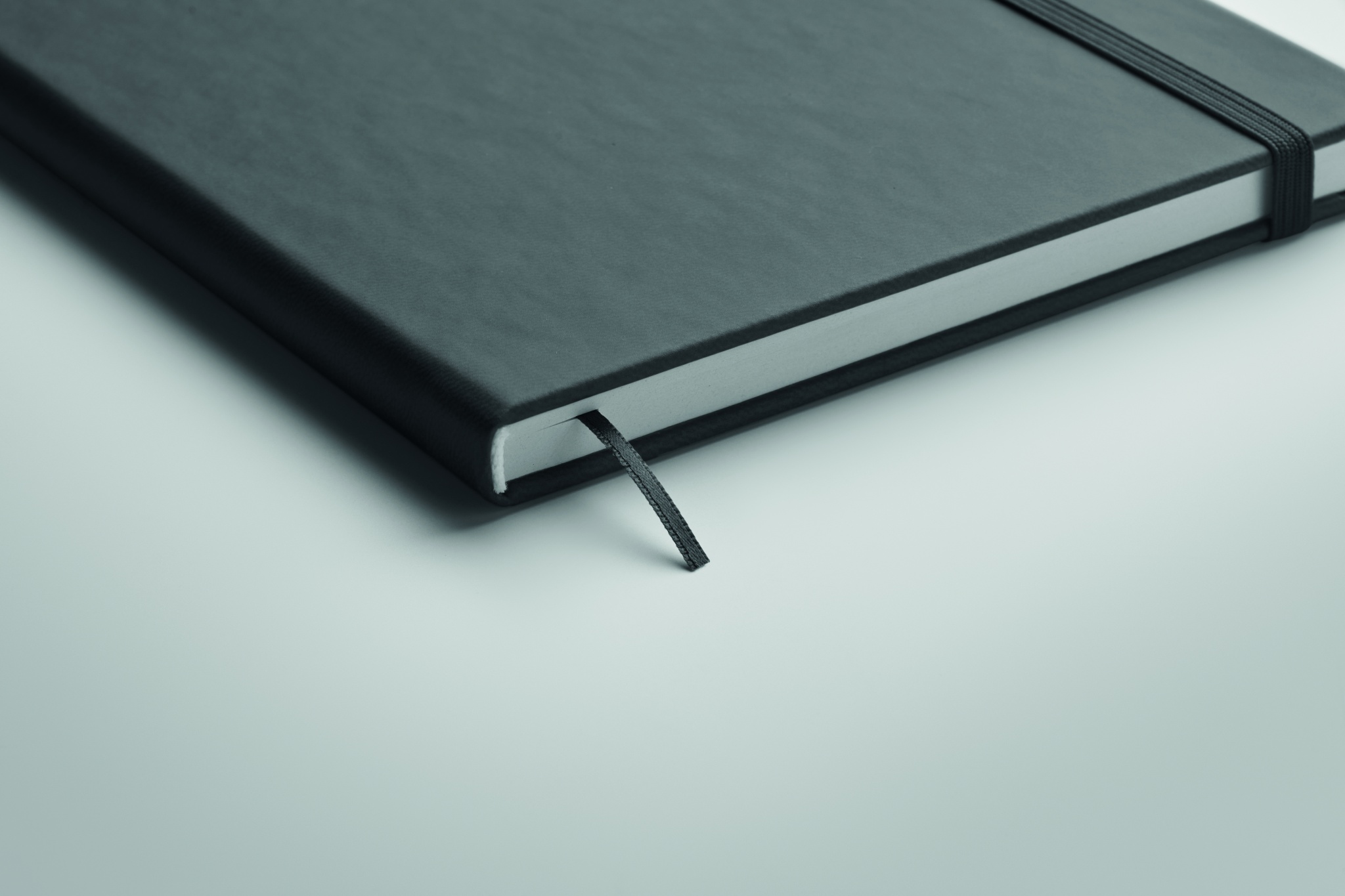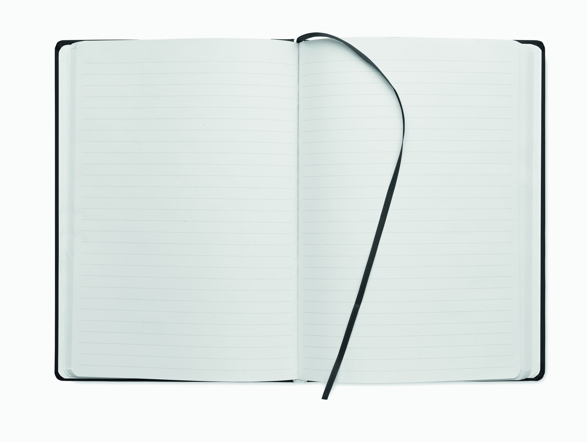 A5-muistikirja kovalla PU-kannella. 200 viivoitettua sivua (100 arkkia) kierrätyspaperia (80 g/m²). Kiinnitys kuminauhalla ja kirjanmerkki. Valmistettu EU:ssa.