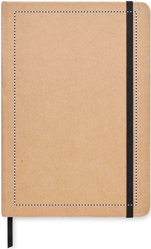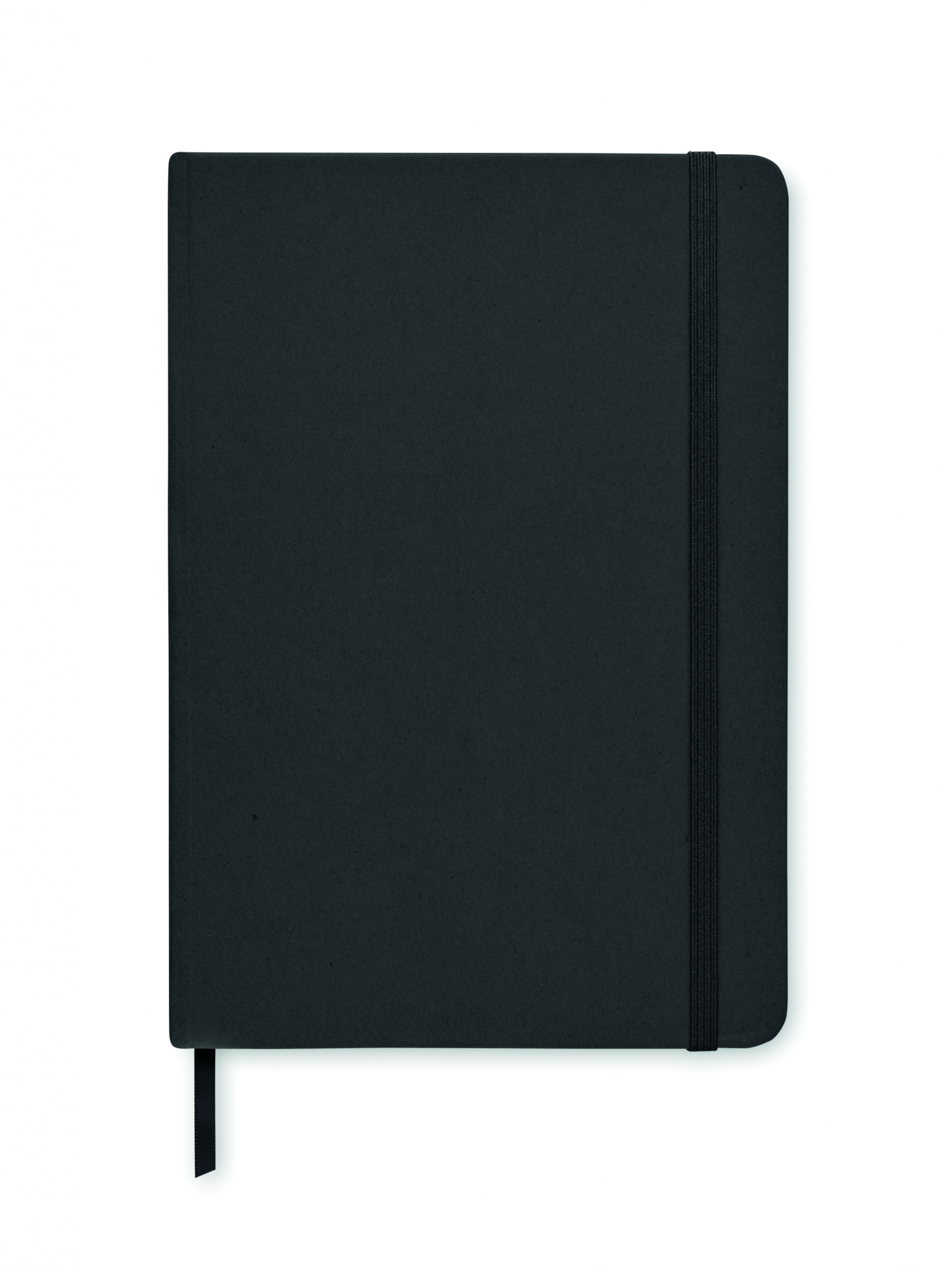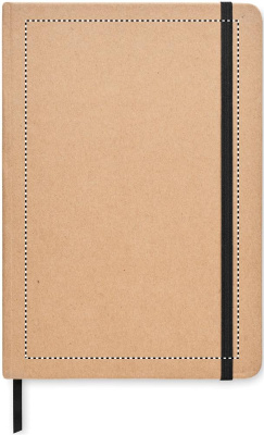 Kierrätyskartongista valmistettu muistikirja A5. Sisäsivut kivipaperia, 160 viivoitettua sivua (80 arkkia). Kiinnitys kuminauhalla ja kirjanmerkki.