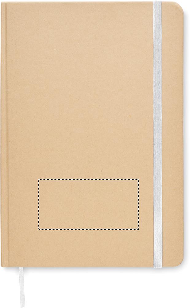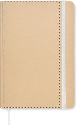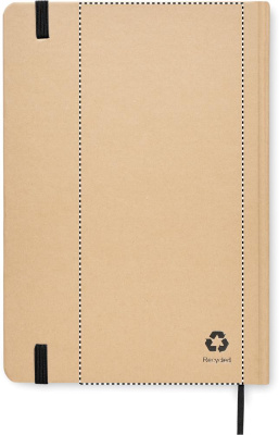 Kierrätyskartongista valmistettu muistikirja A5. Sisäsivut kierrätyspaperia, 160 ruudutettua sivua (80 arkkia). Kiinnitys kuminauhalla ja kirjanmerkki.