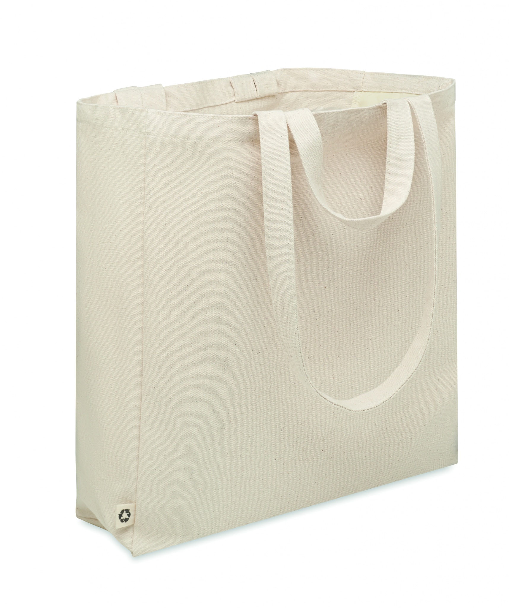 Kierrätysmateriaalista valmistettu ostos- tai rantakassi lyhyillä kantokahvoilla. Kassissa on vetoketjullinen sivutasku. Materiaali 70 % kierrätettyä puuvillaa/ 30 % kierrätettyä polyesteriä, 380 gr/m².