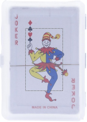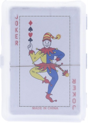 Klassiset pelikortit muovikotelossa, sisältää 54 korttia.