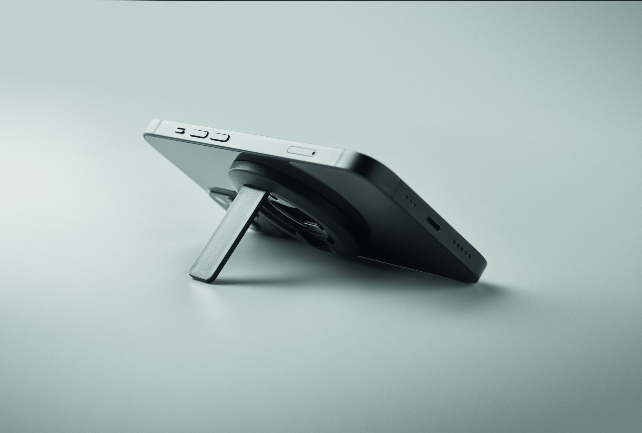 Magneettinen puhelinteline ja teline pullonavaajalla. Yhteensopiva iPhone® 12:n ja uudempien kanssa. Mukana ylimääräinen magneettinen metallirengas muiden ei-magneettisten langattomien ladattavien puhelimien lataamiseen.