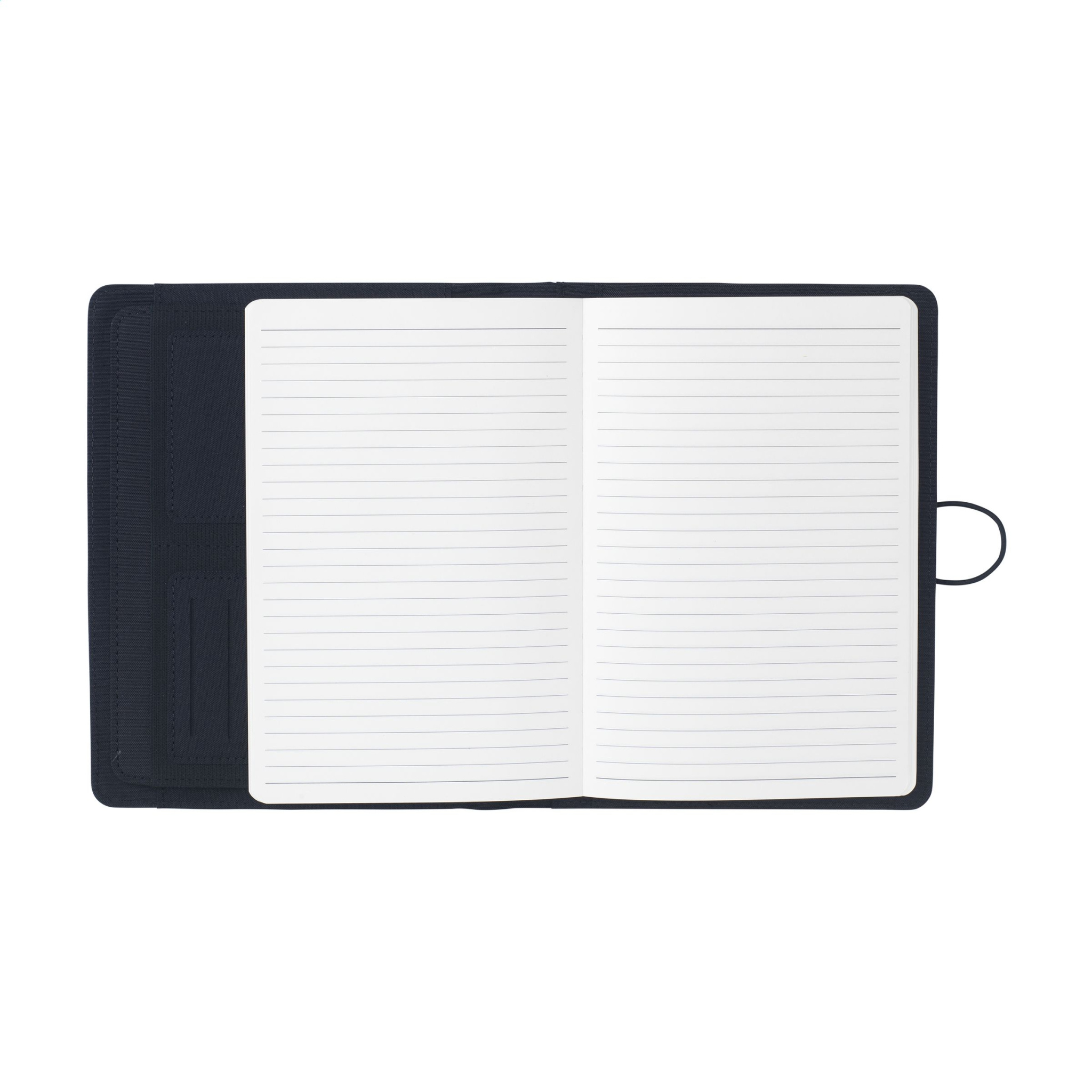 Vau! Moderni A5-kokoinen konferenssi-/asiakirjakansio RPET-materiaalista. Varustettu erilaisilla sisätaskuilla, mukaan lukien erillinen lokero matkapuhelimen säilytystä varten, kaksi lokeroa korteille ja lenkki kynän kiinnitystä varten. Sisältää muistikirjan, jossa on n. 64 arkkia FSC®-sertifioitua kermanväristä paperia (70 g/m²).