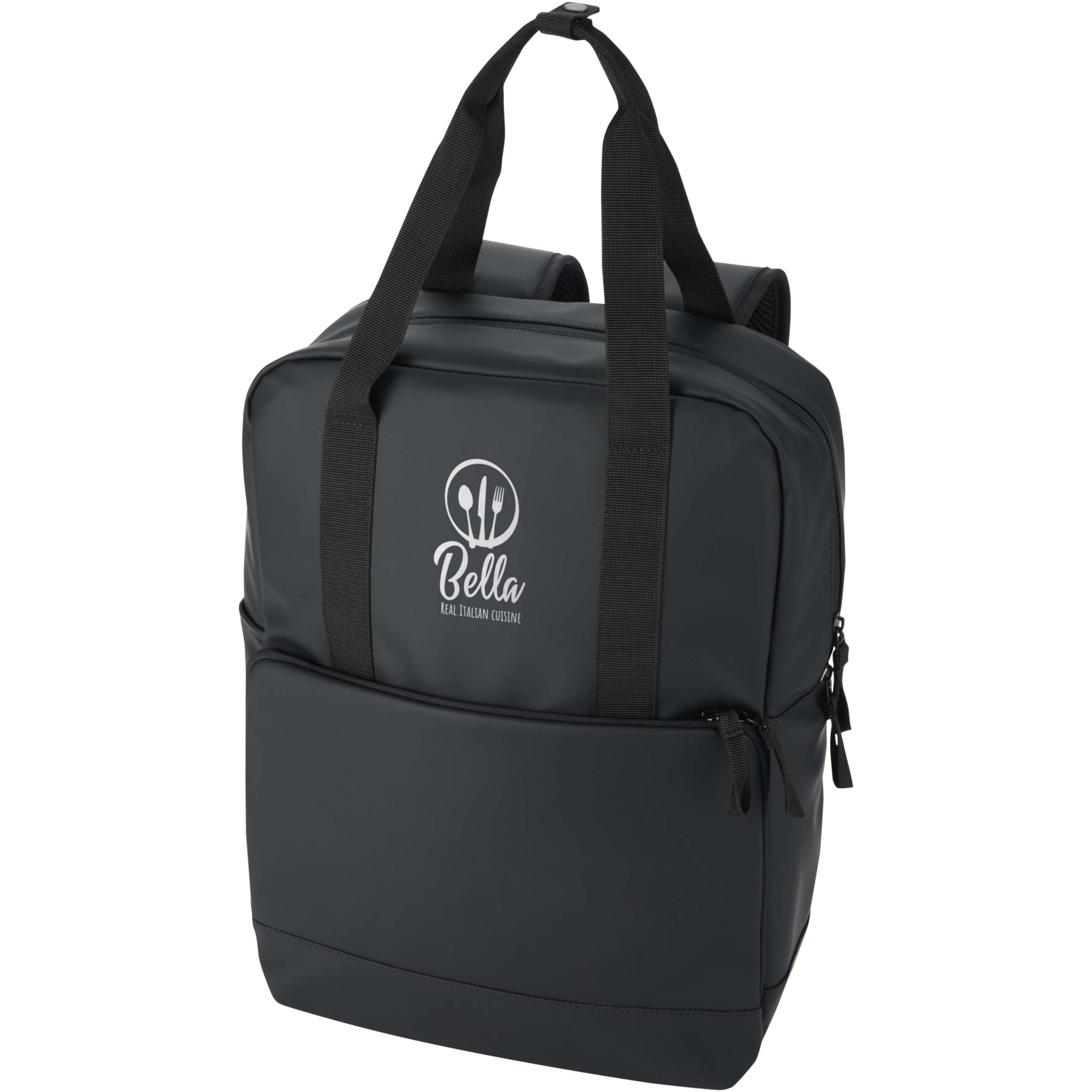GRS-sertifioidusta kierrätetystä PU-nahasta ja saman värisestä RPET-vuorista valmistettu 18-litrainen kylmäreppu on suunniteltu ulkoilmaseikkailuihin. Tilava päälokero on eristetty korkealaatuisella PEVA-vuorilla ja paksulla PE-vaahtomuovilla. Reppu säilyttää ruoan ja juomat viileinä, ja joustavat nauhalenkit pitävät viinipullon tukevasti paikallaan. Suuri pehmustettu vetoketjullinen etutasku tarjoaa lisäsuojaa, ja avoimessa sivutaskussa voi kuljettaa vaikkapa juomapulloa. Mukavuutta varten laukussa on hengittävä verkkokangas selkäpuolella sekä säädettävät ja pehmustetut olkahihnat. Täydellinen piknikille, rannalle ja retkeilyyn.