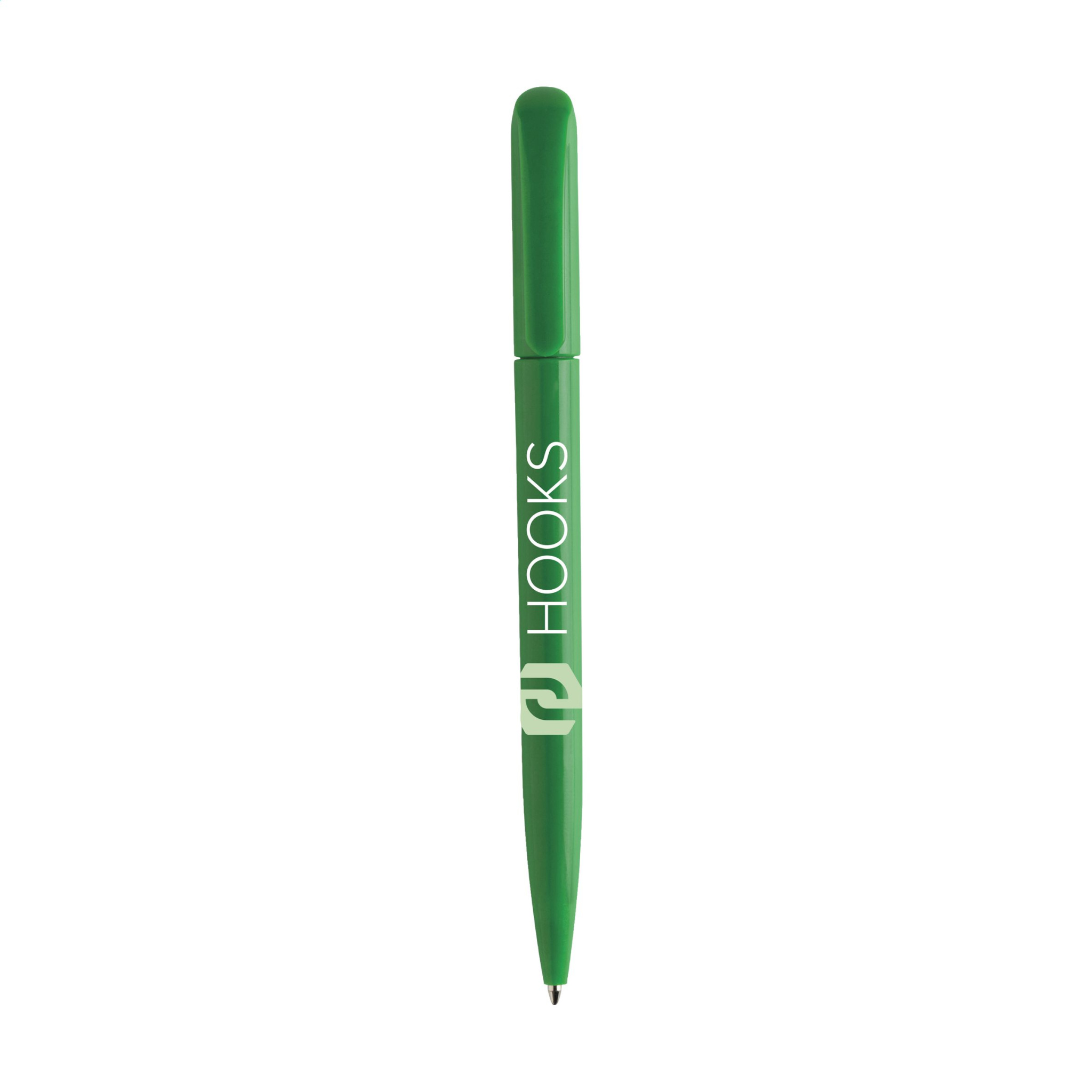 Sinisellä tai mustalla musteella varustettu kuulakärkikynä, jossa on kaareva klipsi ja kierremekanismi.