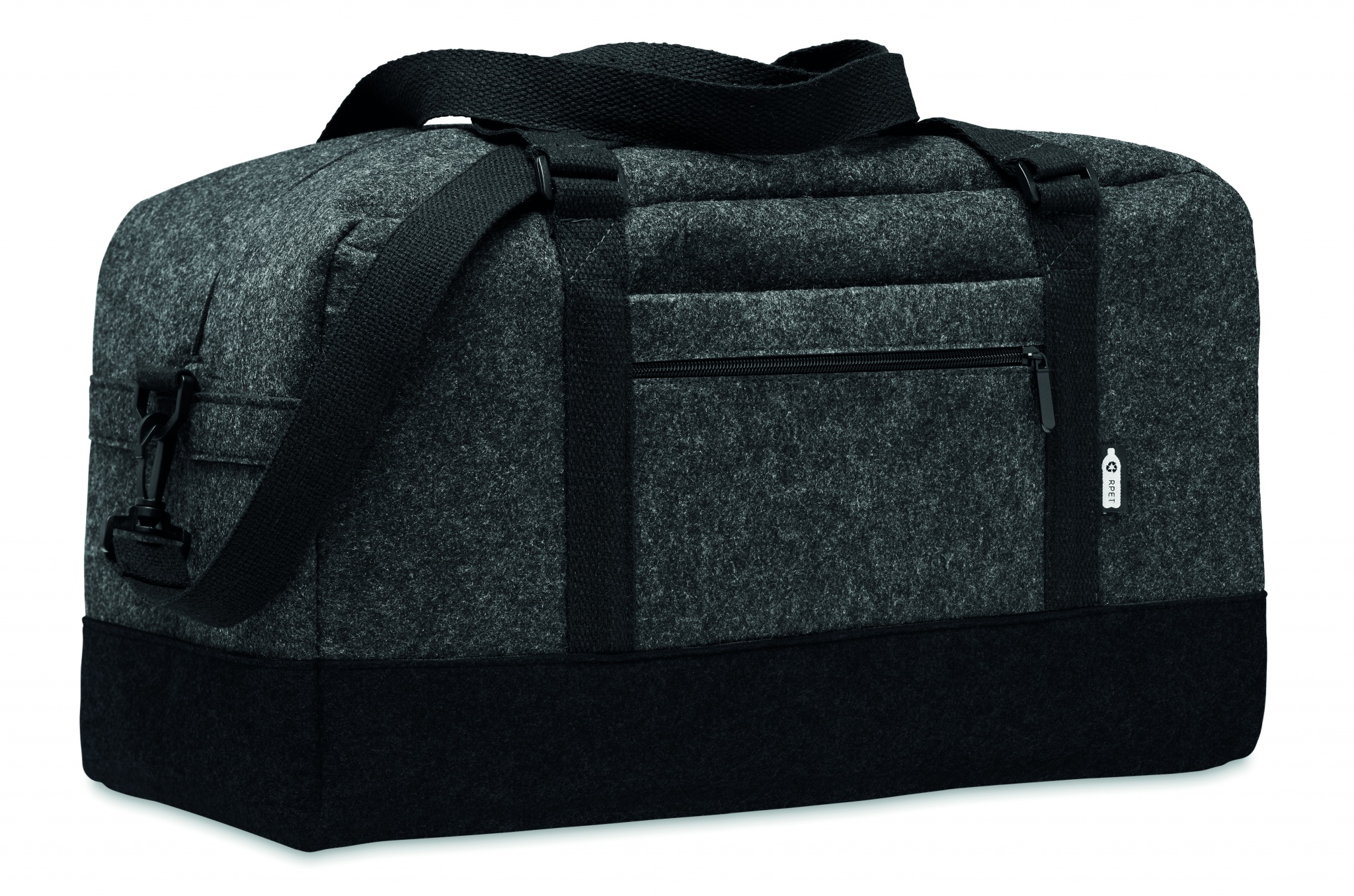 RPET huopakassi vetoketjullisilla etutaskuilla. Irroitettavalla/ säädettävällä olkahihnalla.