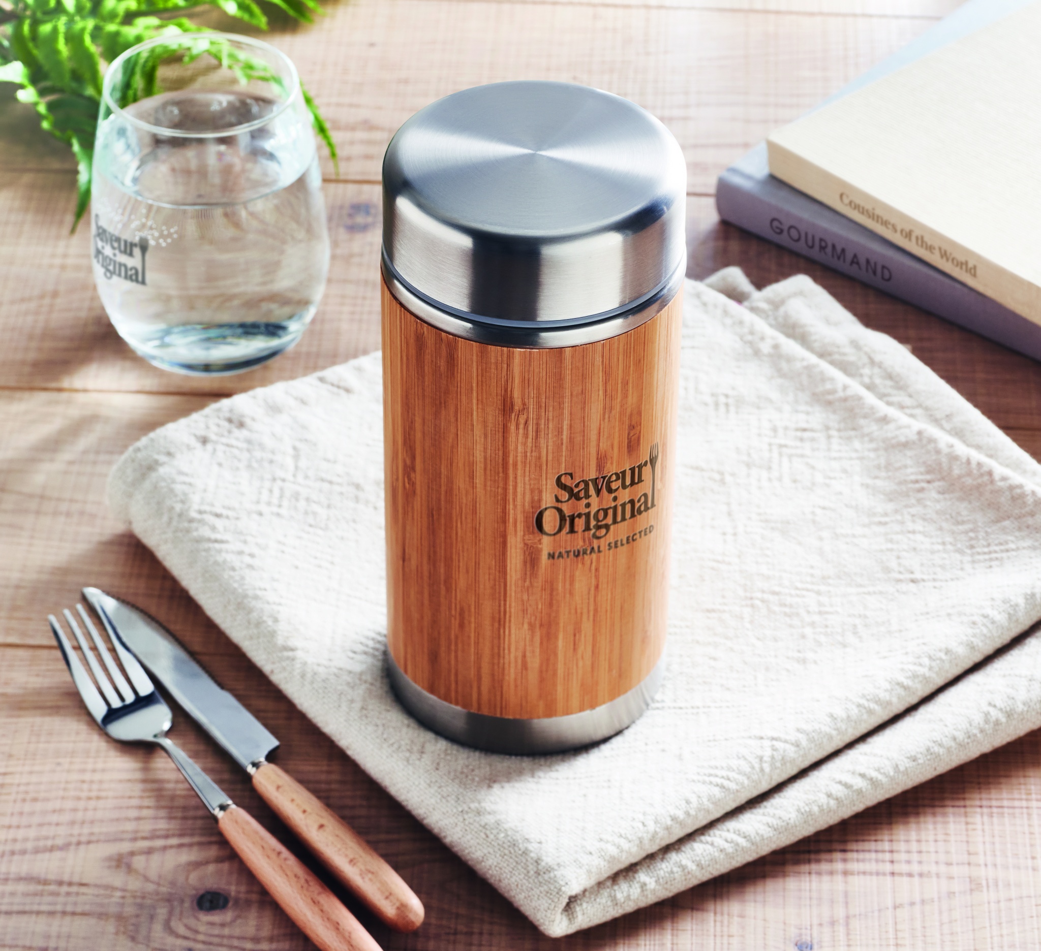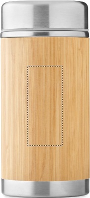 Kaksiseinäinen ruostumattomasta teräksestä valmistettu ruokatermos jossa on kierrekorkki ja ulkopinta bambua. Tilavuus 600 ml.