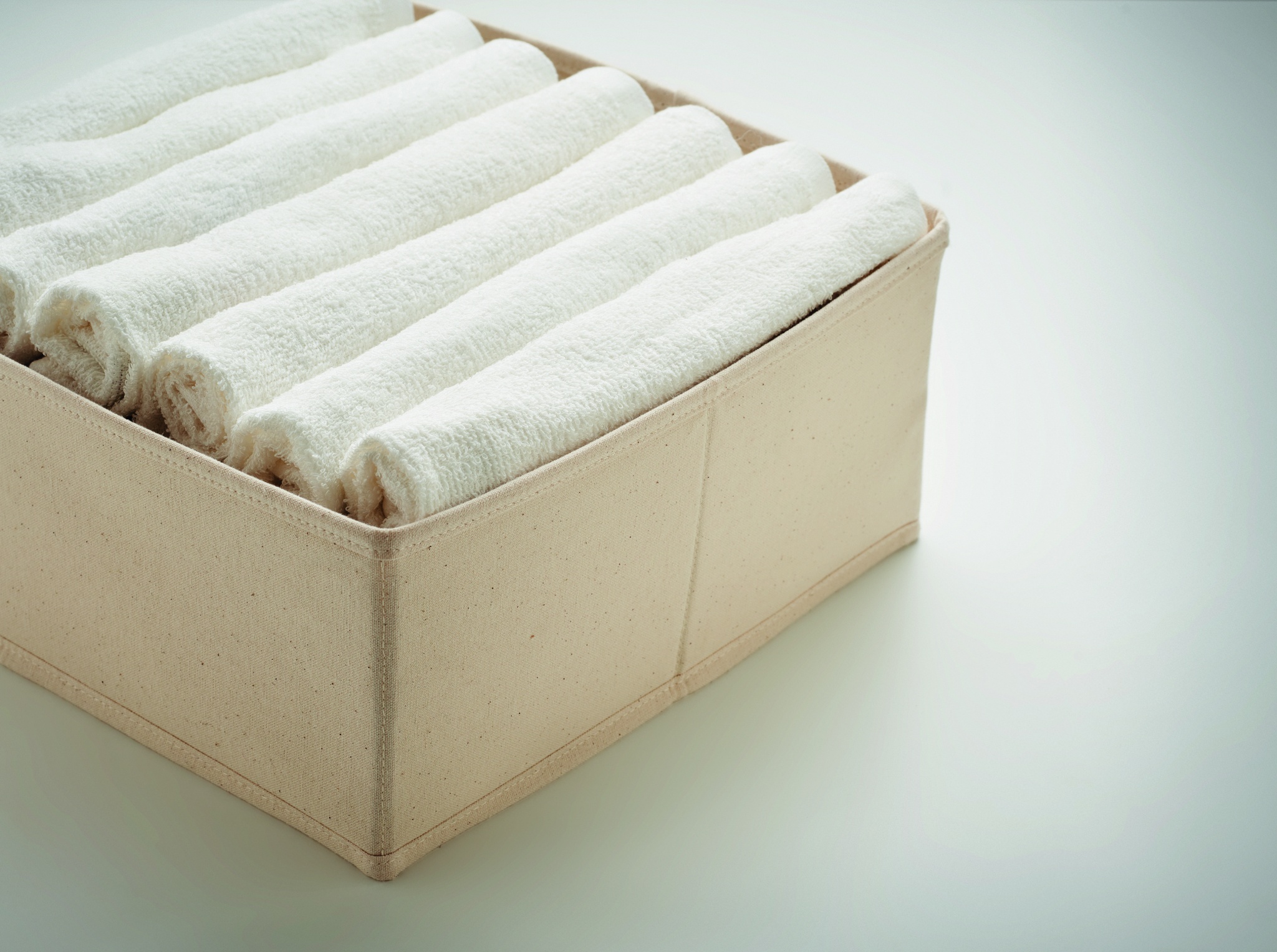 Suuri kokoontaitettava tarvike- tai säilytyslaatikko puuvillaa (220 gr/m²). Toimitetaan puuvillaisessa (140 gr/m²) kiristysnauhapussissa.