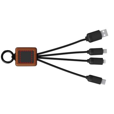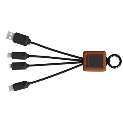 Puusta valmistettu 3-in-1-kaapeli valaistuvalla logolla ja kolmella liittimellä (C-liitin/micro-USB/iPhone). Johdot on valmistettu RPET-materiaalista. Kaapelilla voi ladata kolmea laitetta samanaikaisesti. EUROPE EUIPO -patentti.