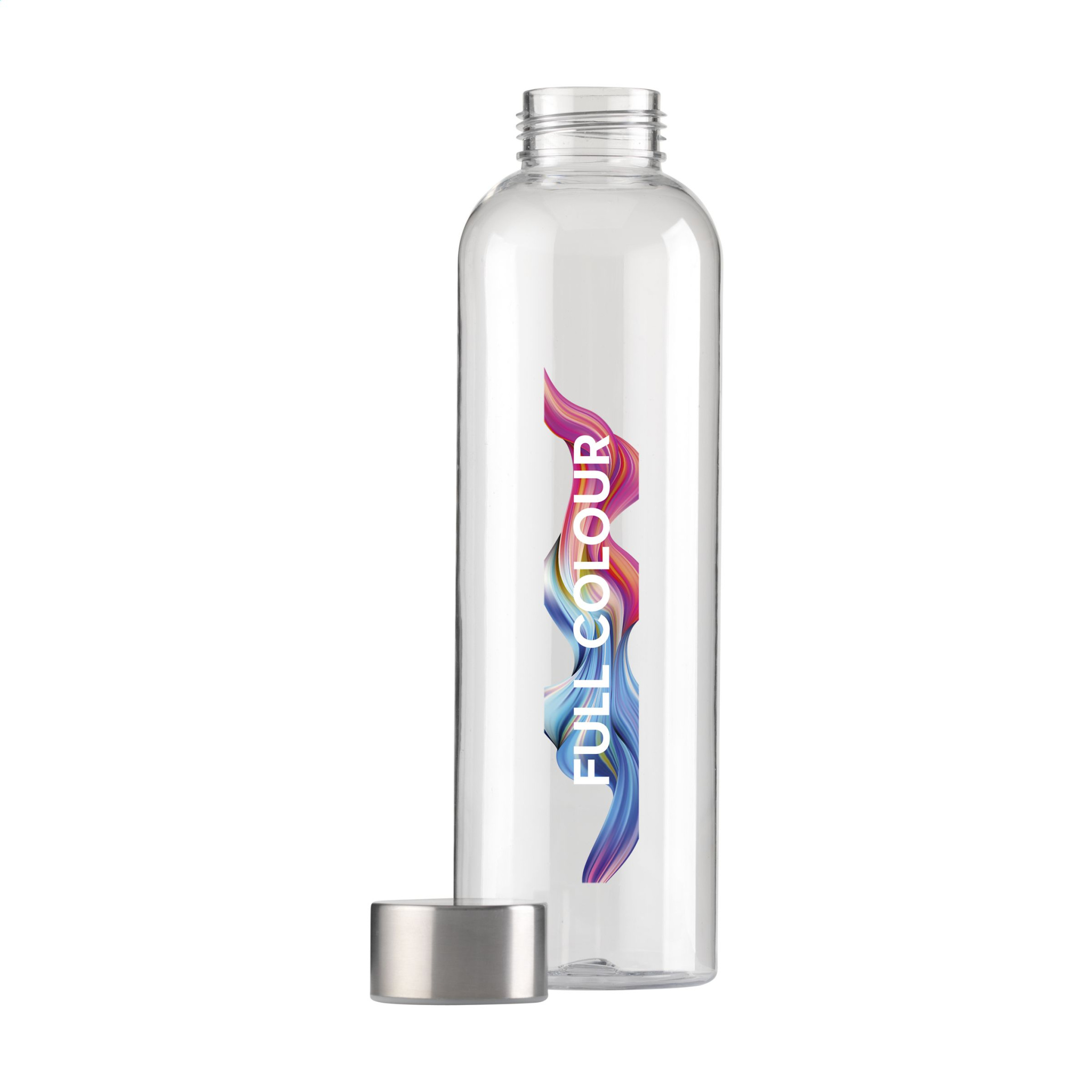Läpinäkyvä, BPA-vapaa vesipullo, valmistettu PCTG SK -muovista. Ruostumattomasta teräksestä valmistettu kierrekansi. Tyylikäs muotoilu kiinnittää huomion välittömästi ja on erittäin mukava. Vuotamaton. Tilavuus 650 ml.