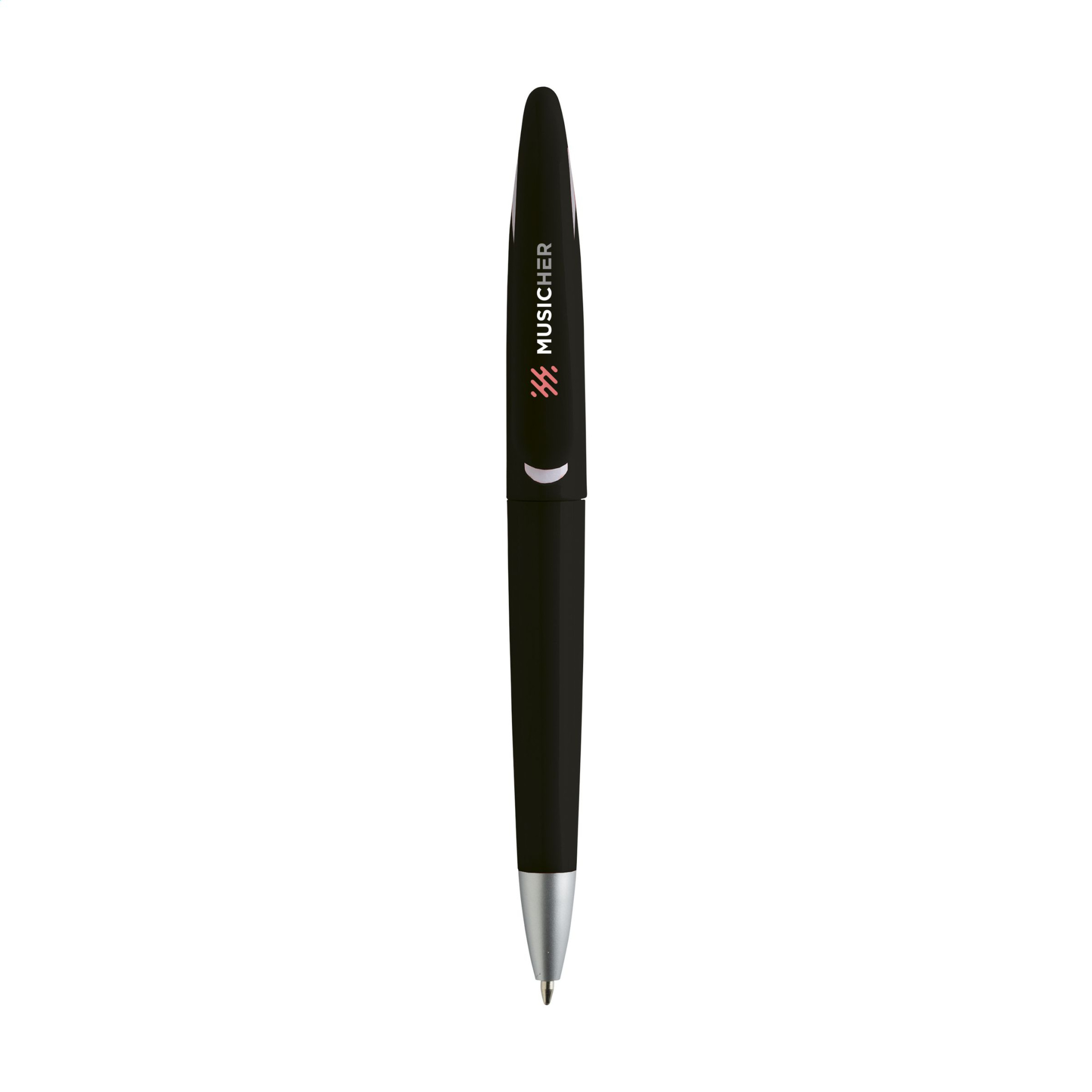 Sinisellä musteella varustettu kuulakärkikynä, jossa on hieno kaareva klipsi, jossa on valkoinen korostus ja kierremekanismi.
