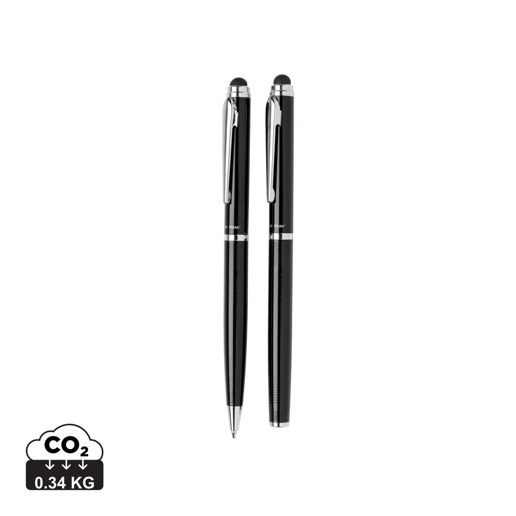Kosketus- ja kuulakärkikynä sekä kosketuskynä settinä. Linjakas kuviointi kynän varressa ja näkyvä paikka logolle. Sisältää Swiss Peak putkimaisen lahjapakkauksen.