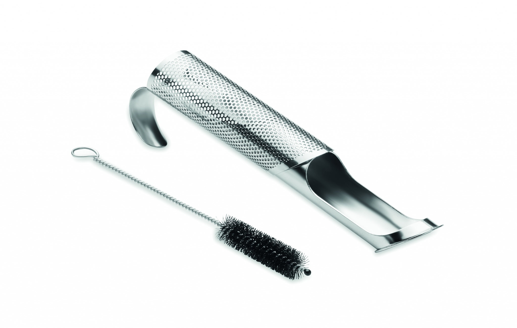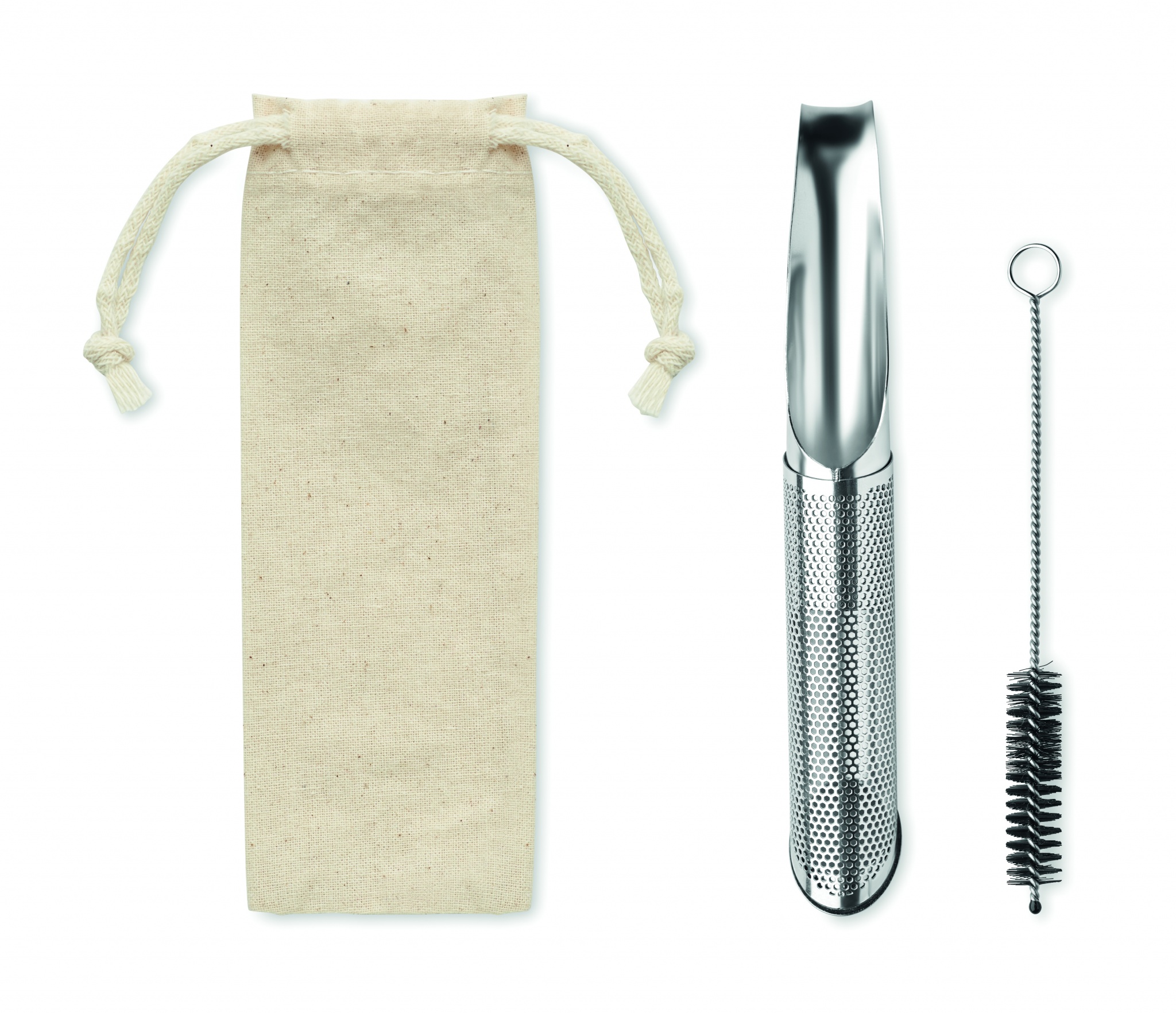 Uudelleenkäytettävä ruostumattomasta teräksestä valmistettu teesiivilä setti puuvillapussissa, sisältää puhdistusharjan.
