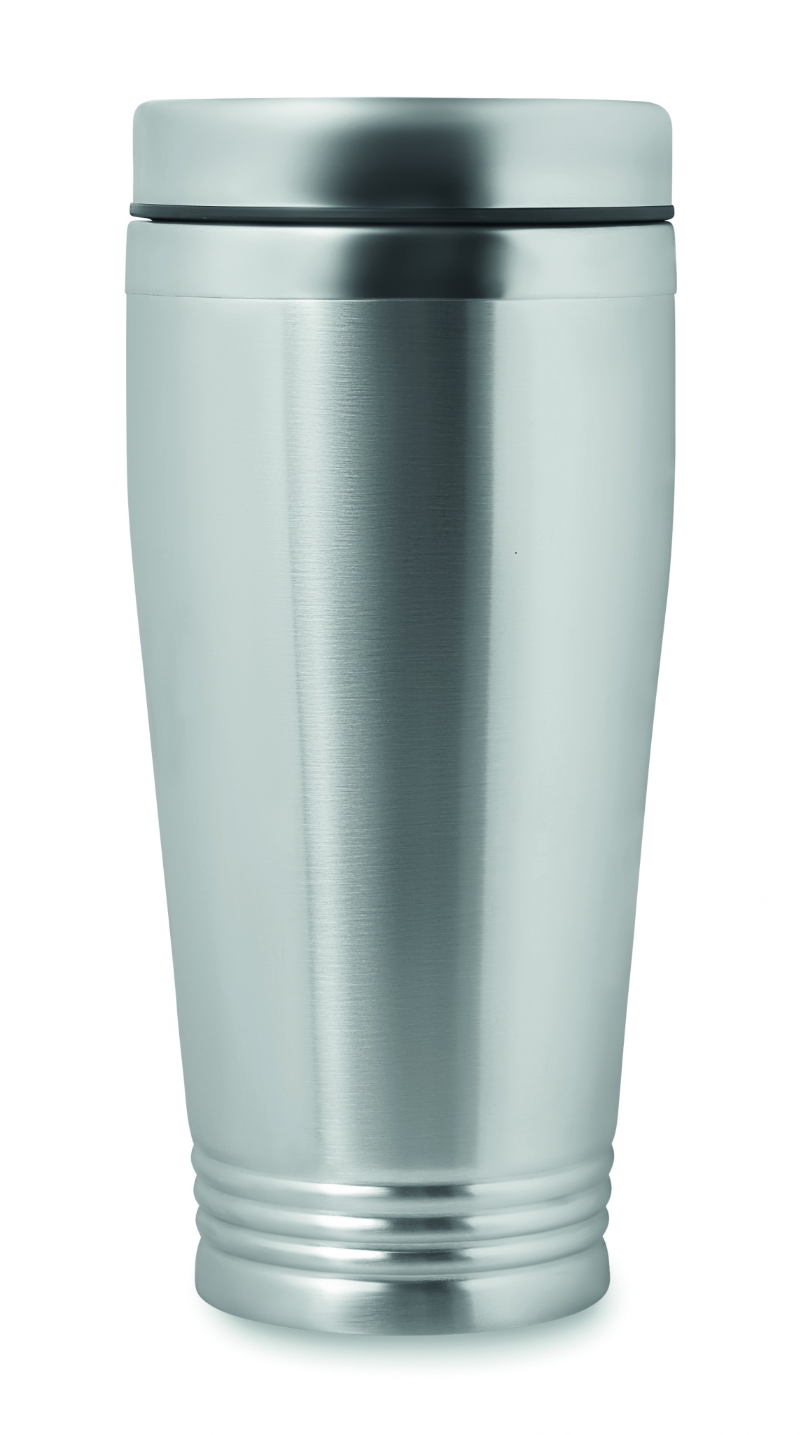 Kaksiseinäinen ruostumattomasta teräksestä valmistettu 400 ml termosmuki, mustalla PP- muovi kannella.