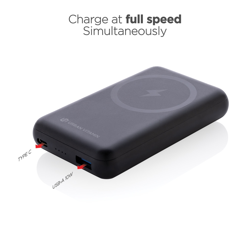 Lataa puhelimesi jopa 2.5 kertaa tällä virtapankilla. Ohuessa ja kompaktissa virtapankissa on sisäänrakennettu nopea 10W langaton magneettinen laturi. Monimuotoinen sisäänrakennettu taitettava jalusta, joka pitää puhelimesi pystyasennossa. Kiitos ultranopean tyypin C PD -portin, virtapankki latautuu uudelleen ennätysajassa. Puhelimen lataaminen 50% asti vie vain 30 minuuttia. Virtapankissa on pitkäkestoinen A-luokan 10000 mAh akku, jolla lataat kaikki laitteesi matkoilla ja seikkailuilla. Tupla A-lähtö ja tyypin C-portti mahdollistaa kahden laitteen latauksen samanaikaisesti. Valmistettu RCS (Recycled Claim Standard) sertifioidusta kierrätetystä ABS:stä. Kierrätetyn materiaalin kokonaismäärä: 16% perustuen tuotteen painoon. RCS sertifiointi varmistaa kierrätettyjen materiaalien täysin sertifioidun toimitusketjun. Urban Vitamin -tuotteet on valmistettu ilman PVC:tä, ja pakattu pakkauksiin, joissa on käytetty vähemmän muovia. USB: 5V/3.0A; Tyyppi C: 5V/3.0A, 9V/2.22A, 12V/1.5A.