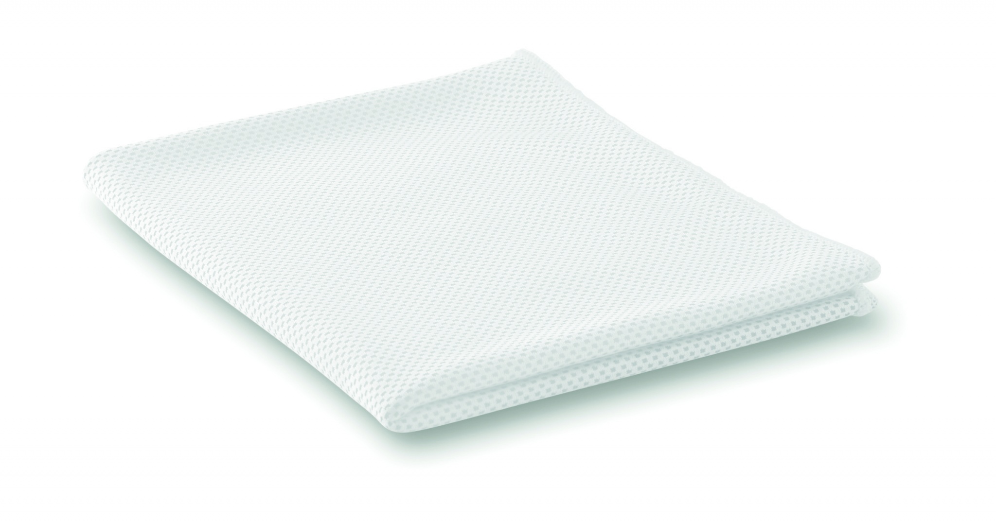 Urheilupyyhe valmistettu 55% polyamidista ja 45% mikrokuidusta, korkea vedenimukyky.