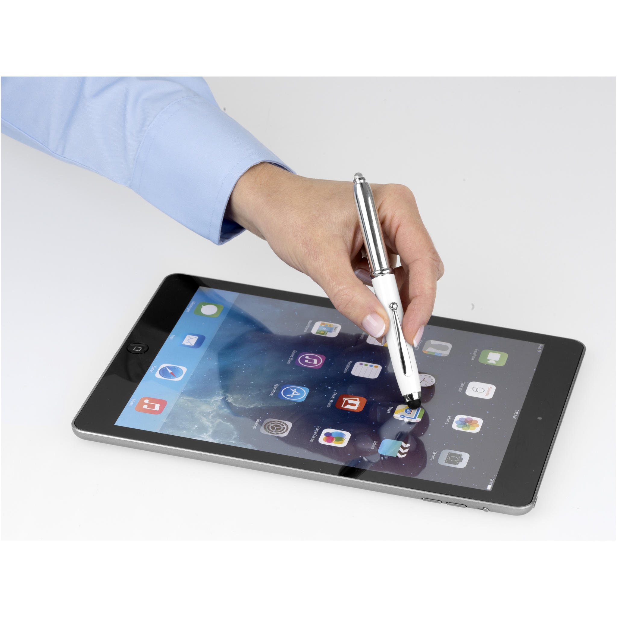 Stylus-kuulakärkikynä, jossa on yksi LED-valo ja irrotettava korkki. Mukana paristot.