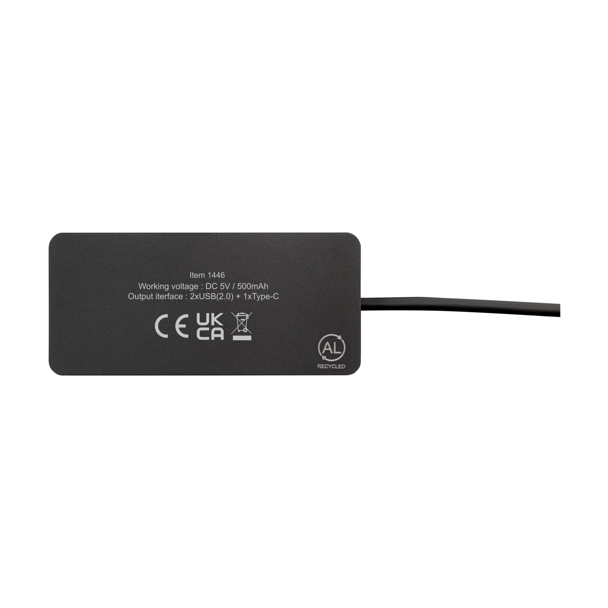 Kompaktiškas, lengvas 2.0 USB šakotuvas. Korpusas pagamintas iš 100% GRS sertifikuoto perdirbto aliuminio. Įrengtas 3 USB prievadai: 1 USB-A 2.0 prievadas ir 2 C tipo prievadai papildomiems įrenginiams prijungti. Tiekiamas su atitinkamu juodu kabeliu su dviguba įvesties jungtimi, tinkantis tiek c tipo, tiek USB-A kompiuteriams. Iš viso perdirbtos medžiagos: 50%. Naudojant perdirbtą aliuminį, gaminant šį gaminį sunaudojama mažiau naujų žaliavų. Tai reiškia, kad sunaudojama mažiau energijos ir sunaudojama mažiau vandens. Atsakingas pasirinkimas. Kiekviena prekė supakuota atskirai.