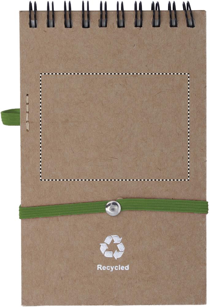Pārstrādāta papīra piezīmju grāmatiņa ar atbilstošu pildspalvu. Divu vadu. 140 parasta otrreizēji pārstrādāta papīra lapas (70 loksnes). Atbilstoša spiedpogas lodīšu pildspalva pārstrādātā kartona kastītē un bioloģiski noārdāmā plastmasā. Zilā tinte. Elastīga aizdares siksna un pildspalvas turētājs.