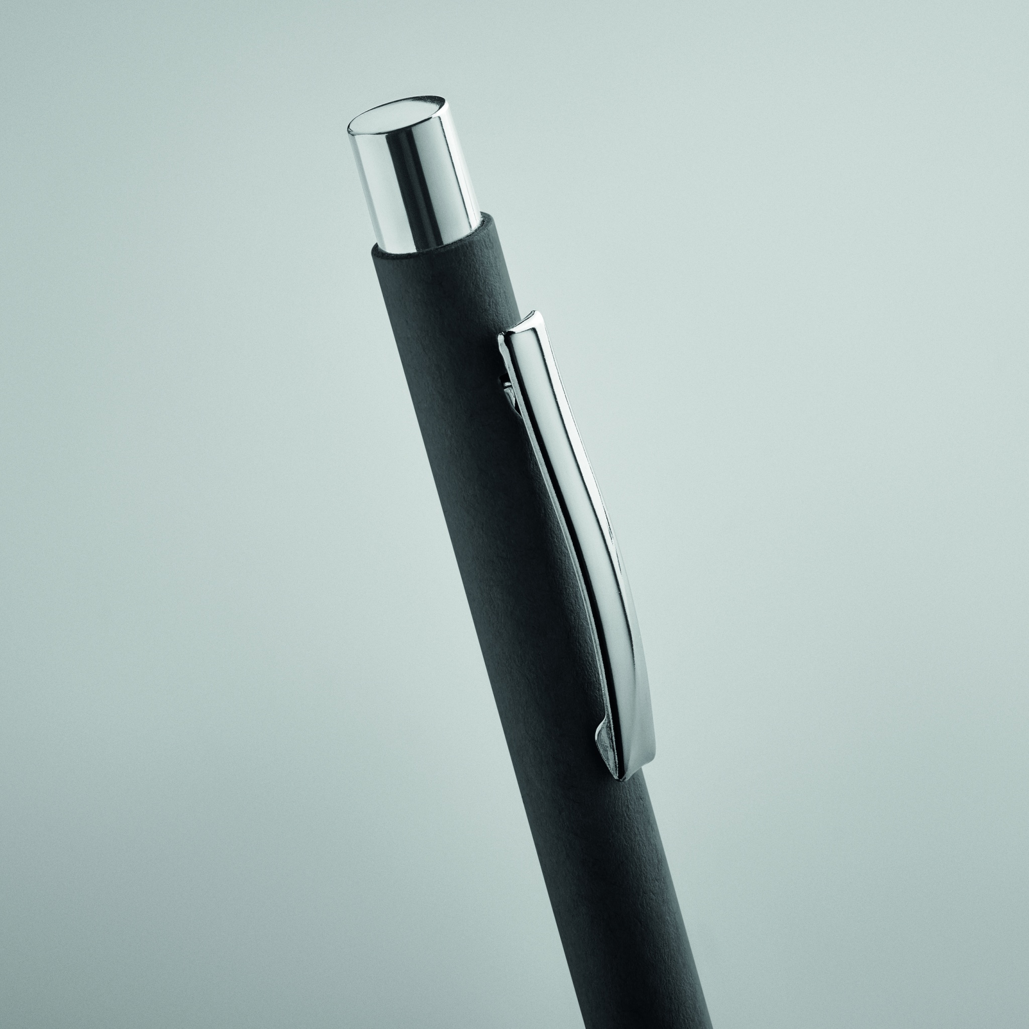 Spiedpogas lodīšu pildspalva no pārstrādāta papīra un metāla klipša un plastmasas piederumi. Zilā tinte.