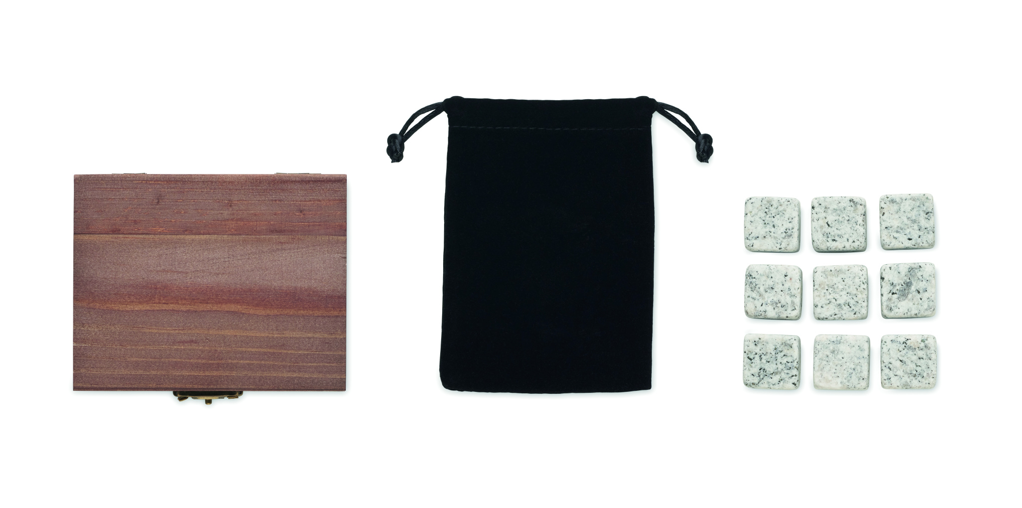 Reusable stone set in pine wood box. Includes 9 stones ice cubes with velvet pouch.