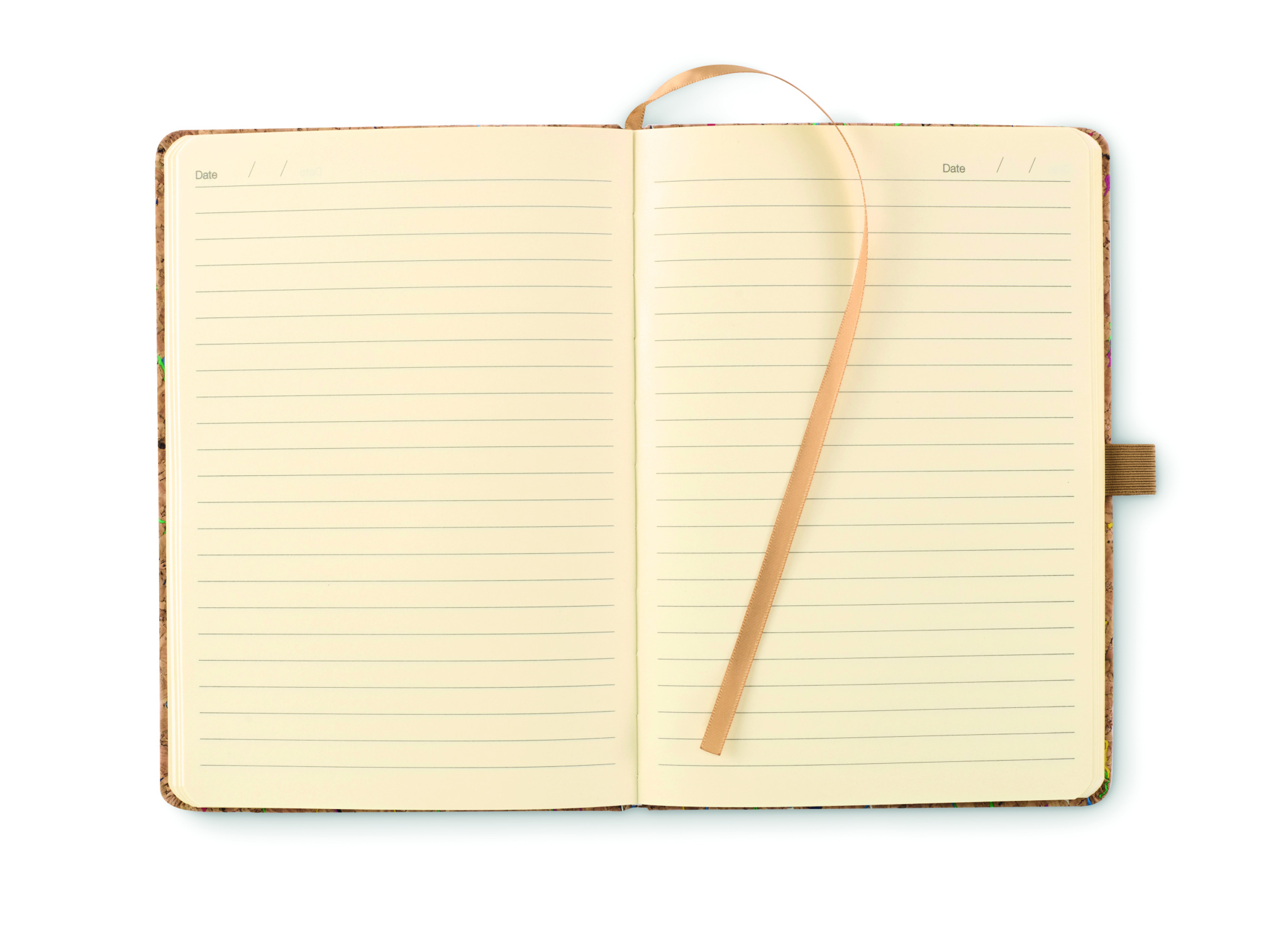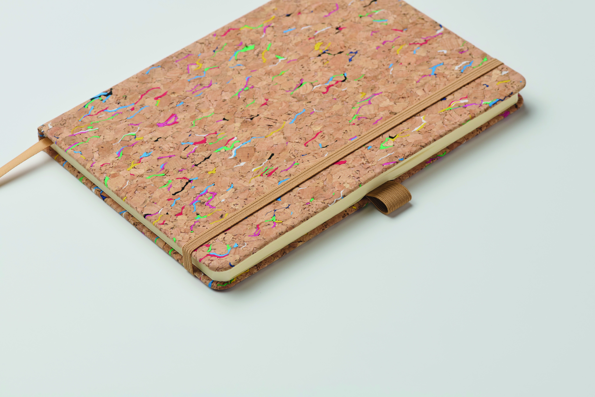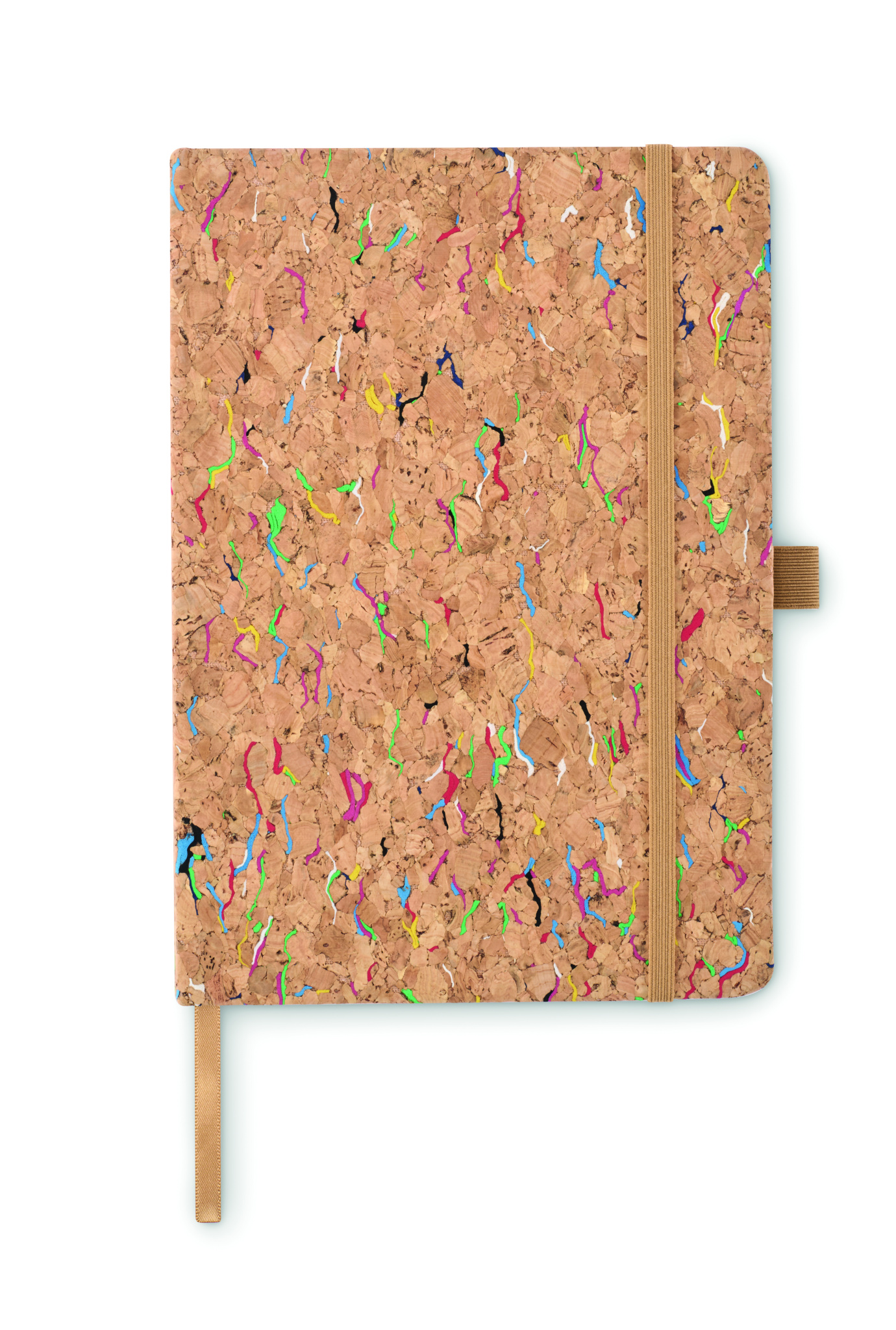 A5 notebook with hard coloured cork cover. Case bound. 192 lined paper (96 sheets). Elastic closure strap, ribbon bookmark and elastic pen holder.