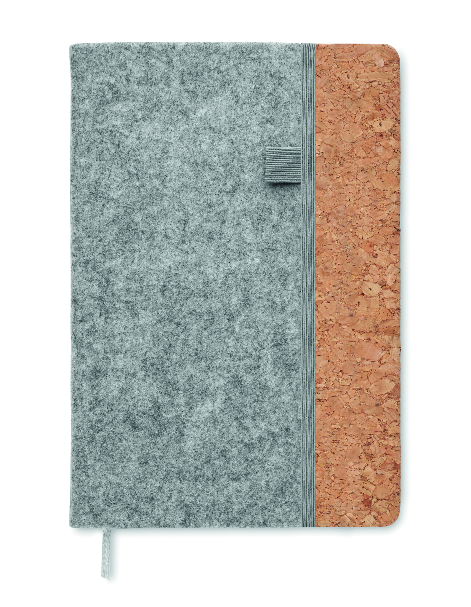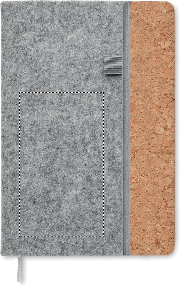 A5 notebook with RPET felt cover and cork. 160 recycled paper lined pages (80 sheets). Elasticated pen loop on front, matching elastic closure strap and ribbon page-marker.