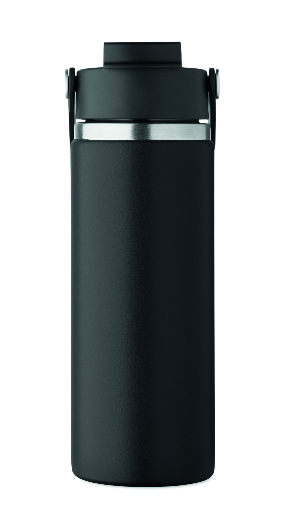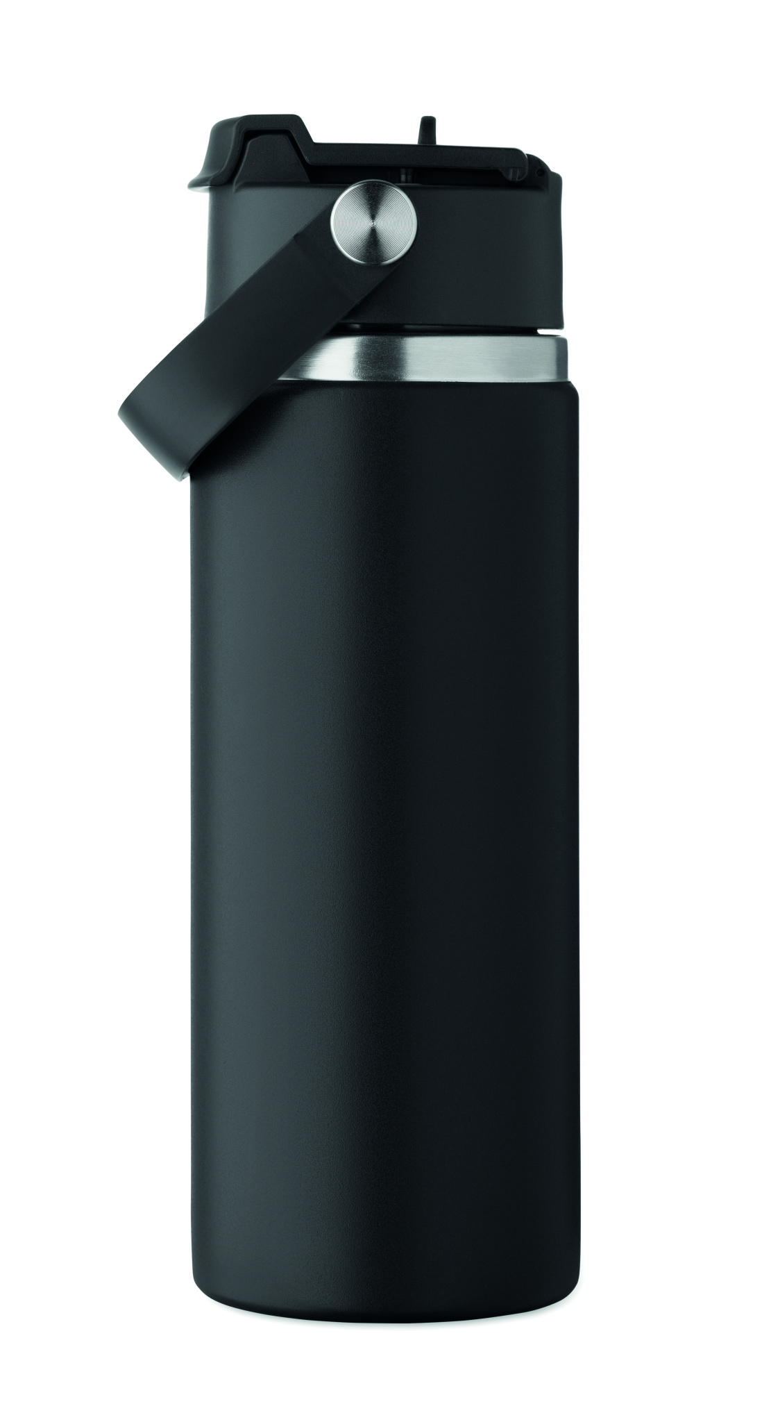 Double wall insulated bottle in recycled stainless steel (90% recycled stainless and 10% stainless steel) with combination straw and sip lid with handle. Leak free. Capacity : 500 ml.