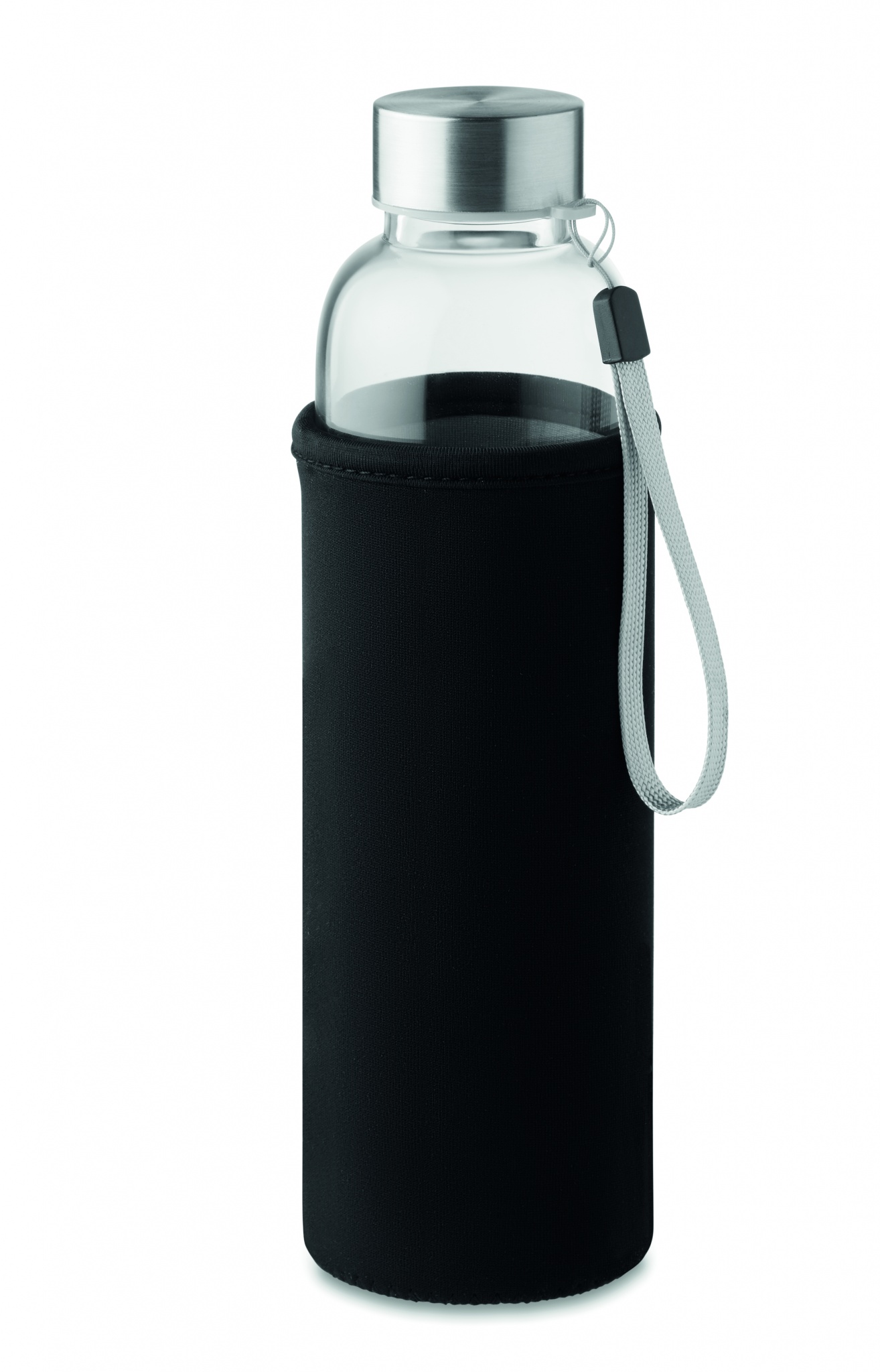 Фляга питьевая из боросиликатного стекла с чайным ситечком в неопреновом чехле. Емкость 500 мл. Не протекает.