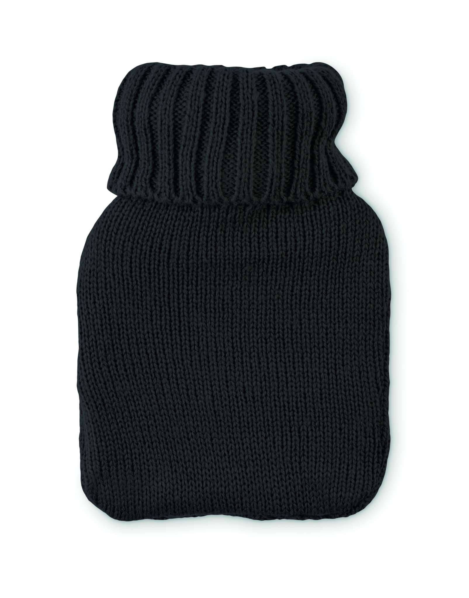 Hot water bottle with knitted acrylic pouch. Used to provide warmth, typically whilst in bed, but also for the application of heat to a specific part of the body. Capacity: 450 ml.