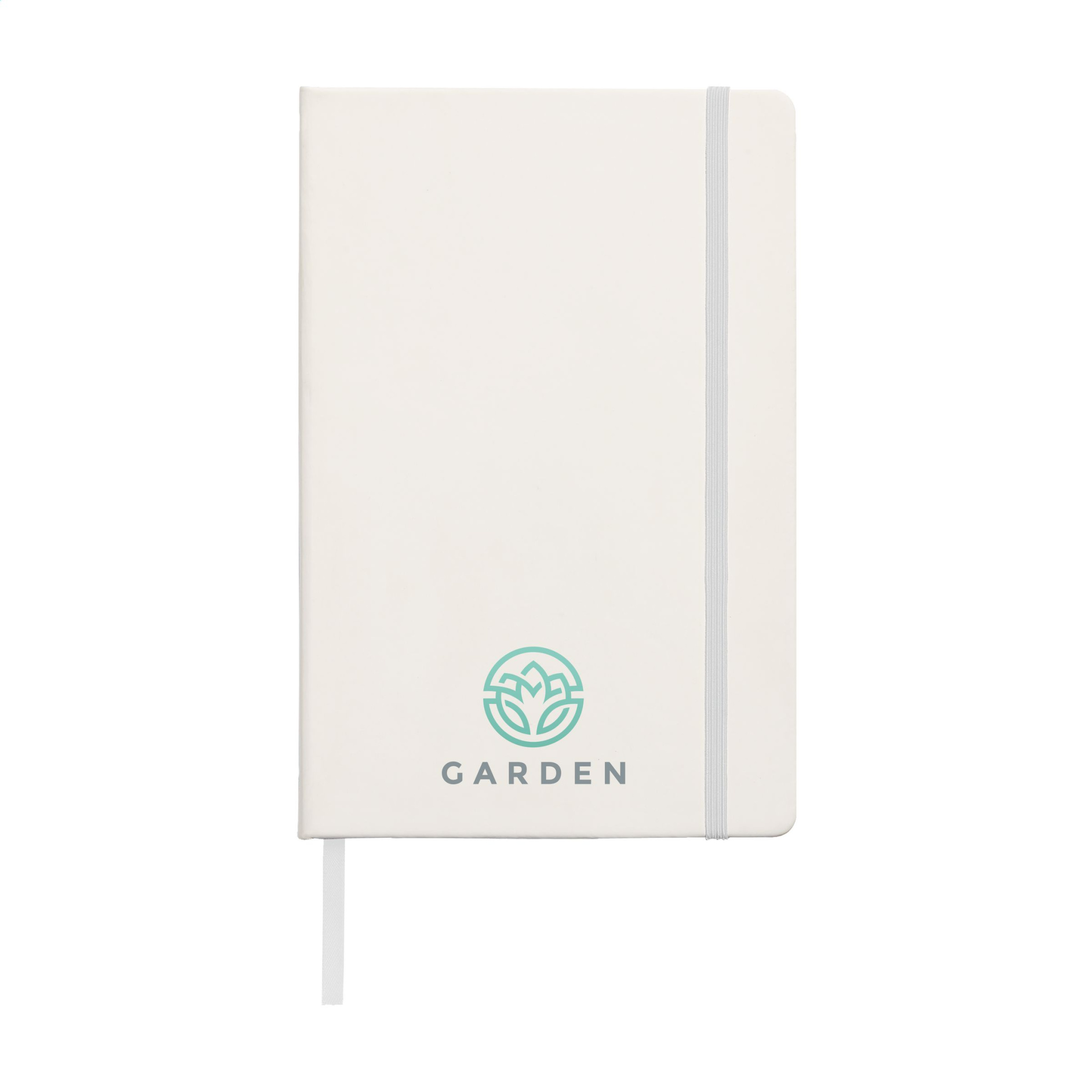Тетрадь формата А5 с примерно 96 листами/192 страницами кремовой линованной бумаги (80 г/м²). С клеевым переплетом, твердой обложкой, карманом, эластичной застежкой и шелковой лентой.