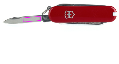 Благодаря небольшому размеру, складной нож Classic SD идеально подходит в качестве очень практичного брелока. Характеристики: 1. небольшое лезвие для резки, 2. пара мини-ножниц, 3. пилка для ногтей, 4. с наконечником в виде отвертки, 5. зубочистка, 6. пинцет, 7. кольцо для ключей.