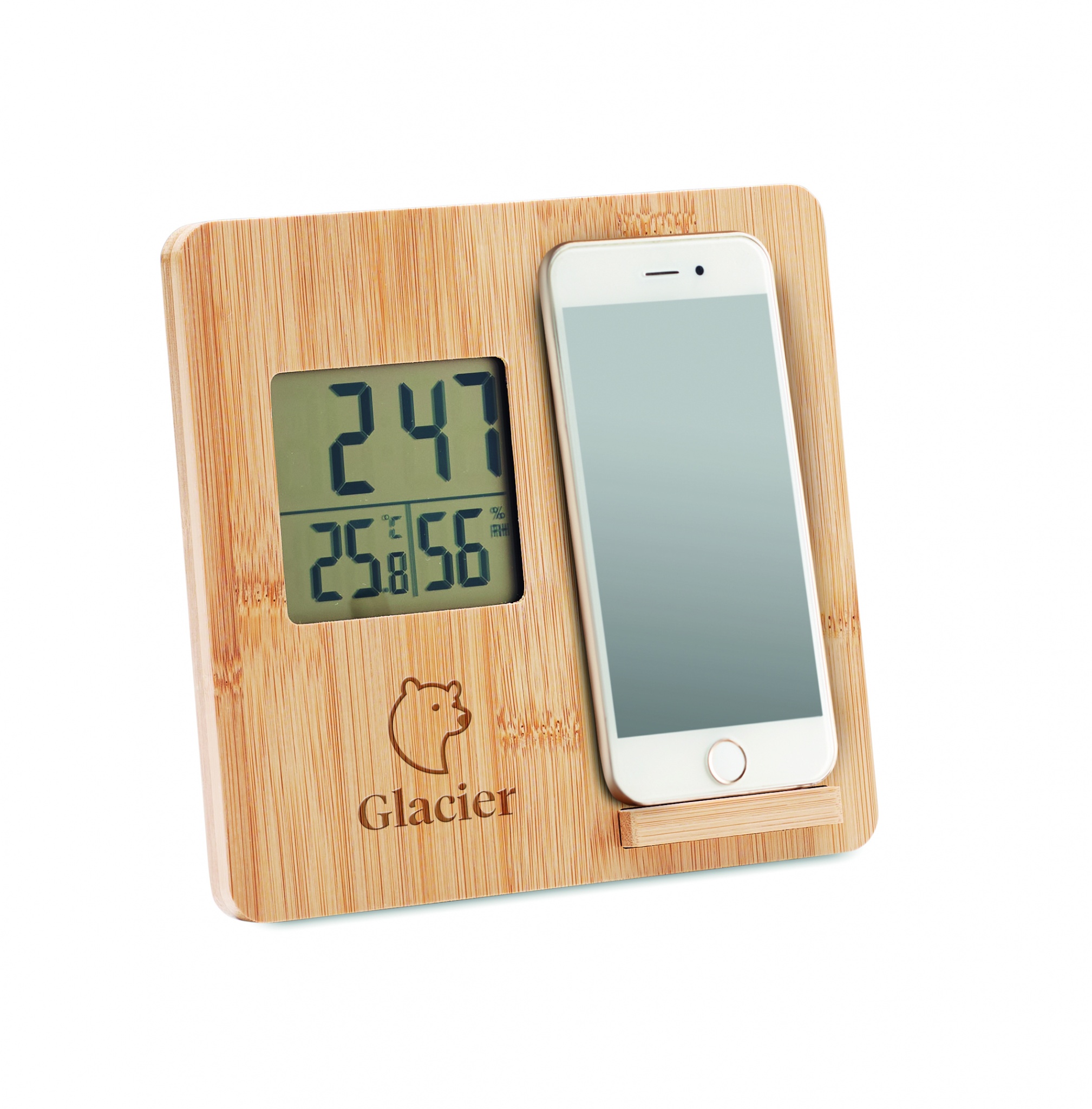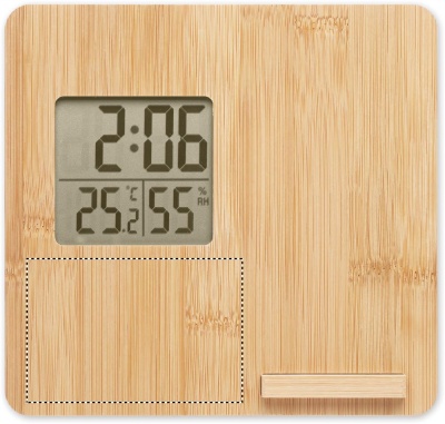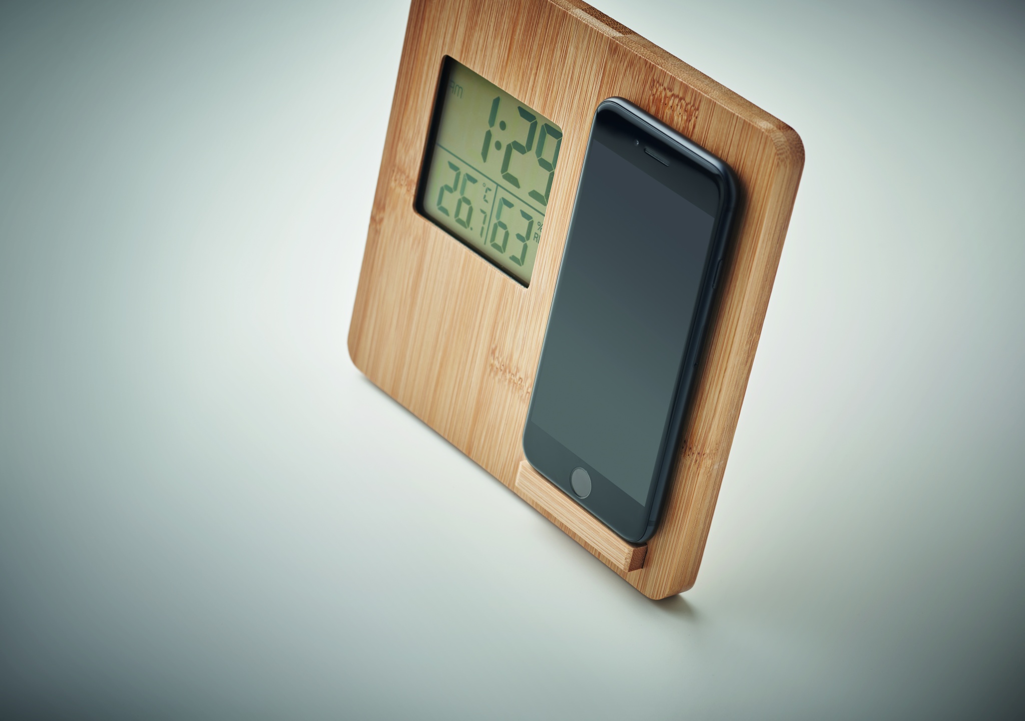 Беспроводное зарядное устройство мощностью 10 Вт с индикацией времени, температуры и влажности, функцией подставки для смартфона в бамбуковом корпусе. Батарейка CR2032 в комплекте. Беспроводной выход: DC 9V/1.10A (10W) для быстрой зарядки. Совместимость с последними моделями андроидов, iPhone® 8, X и новее.