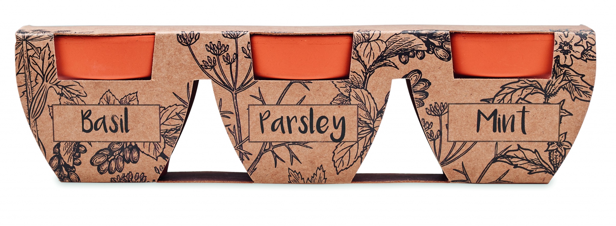 Набор из 3 глиняных терракотовых горшков, включающих 3 сорта семян трав: мяты, петрушки и базилика.
