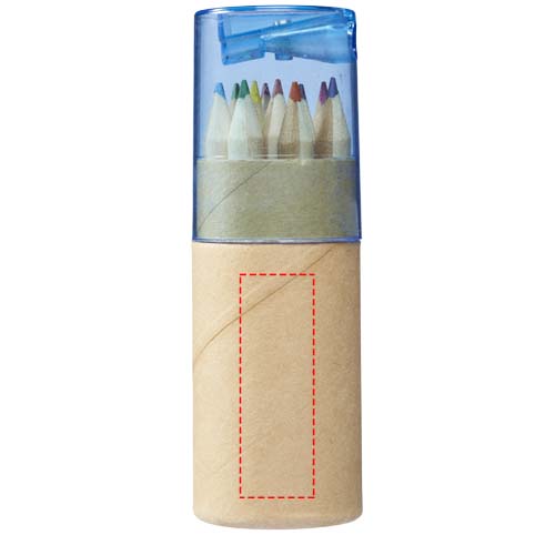 12 цветных карандашей в цилиндрической коробке с точилкой в пластиковой крышке. Нанесение не предлагается на элементы.