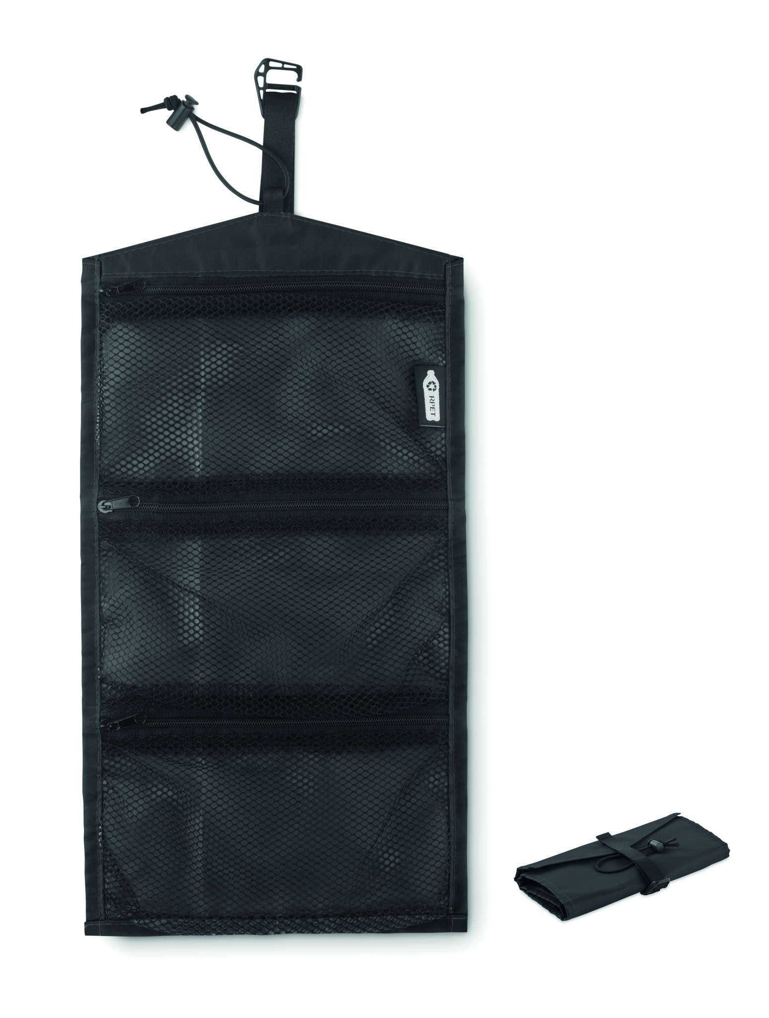 Сумка-органайзер для зарядных кабелей из полиэстера 210D RPET. 3 сетчатых отделения на молнии. Эту сумку можно также использовать как косметичку.