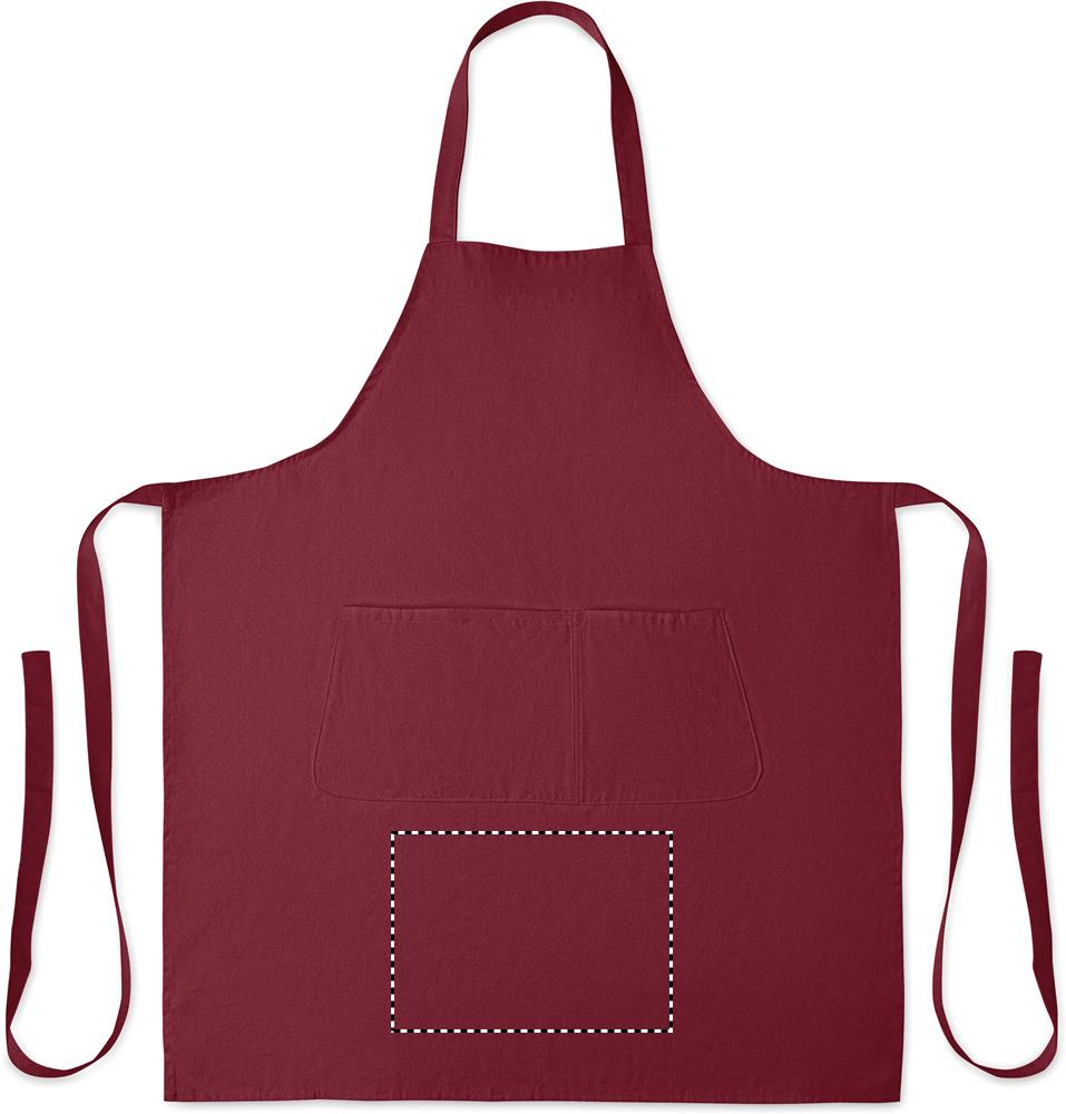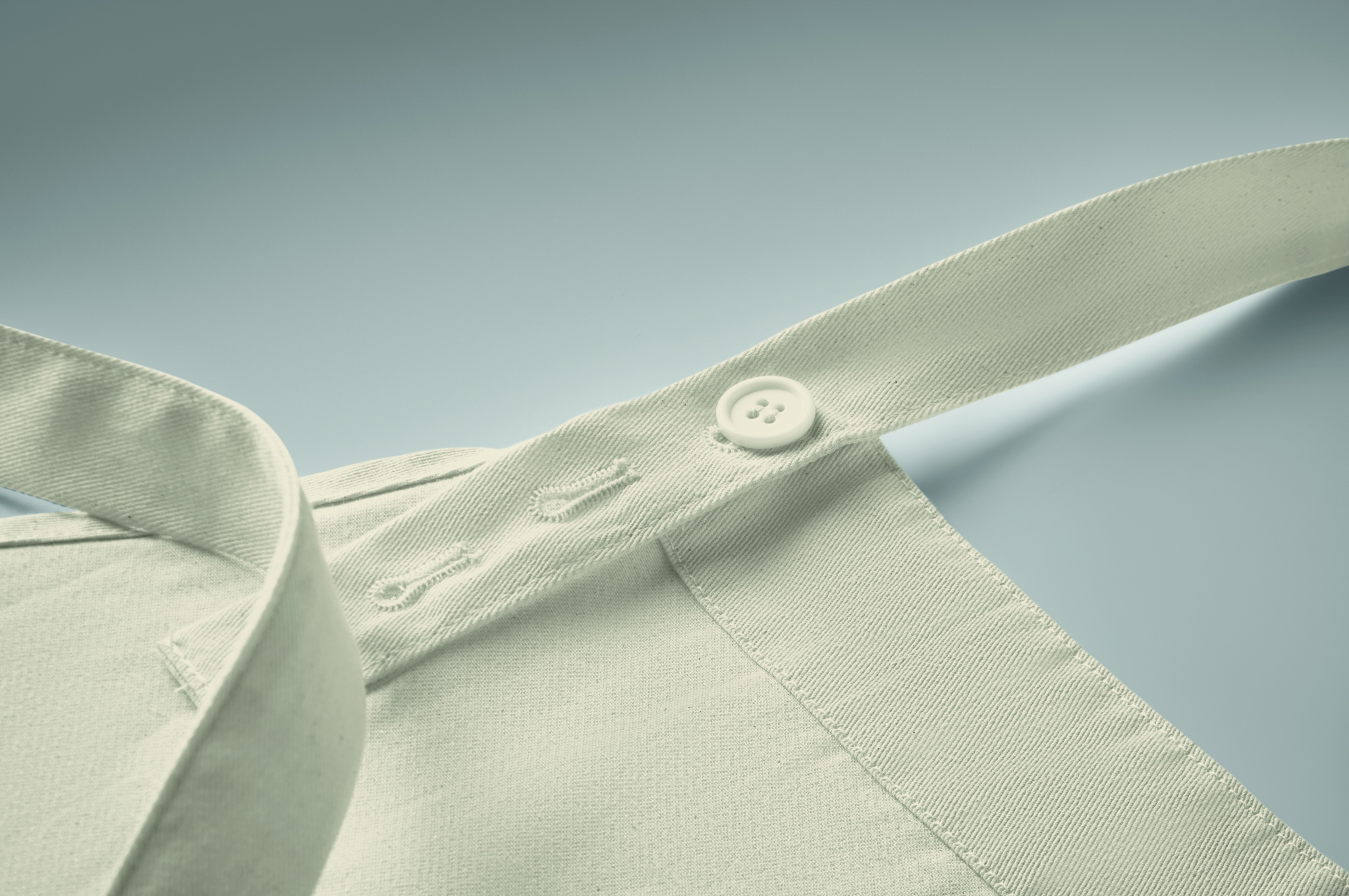 Adjustable bib apron with 1 large front pocket with 2 compartments in 240 gr/m² organic cotton. With adjustable button on the neck strap.