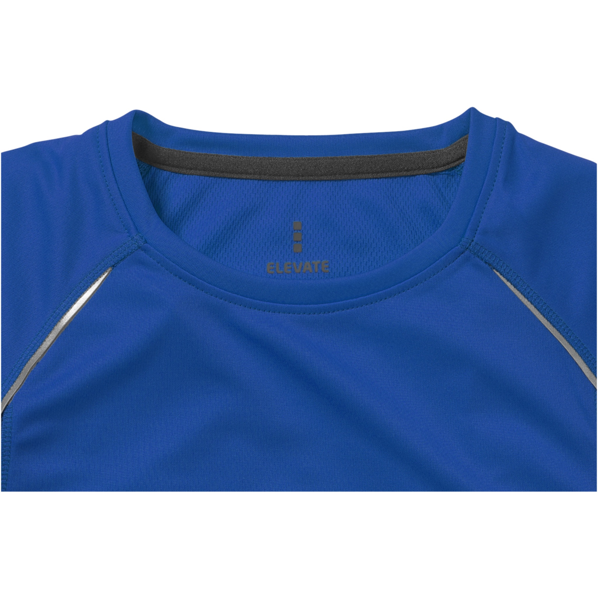 Воротник из ткани изделия. Круглый вырез горловины. Боковые панели из сетчатой ткани. Отражающие детали. Рукава реглан. Комфортный ярлык-трансфер на изделии. Тонкий шов. Атласный кант по линии горловины.