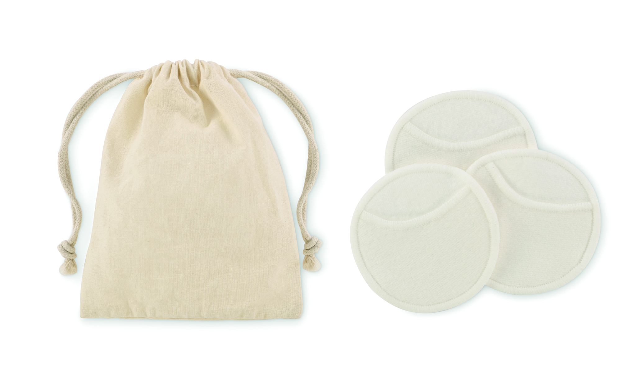 3 pieces of reusable and washable soft face cleaning pads (diameter 8cm) made of 70% bamboo fibre and 30% cotton in cotton pouch.