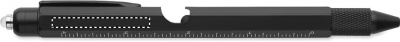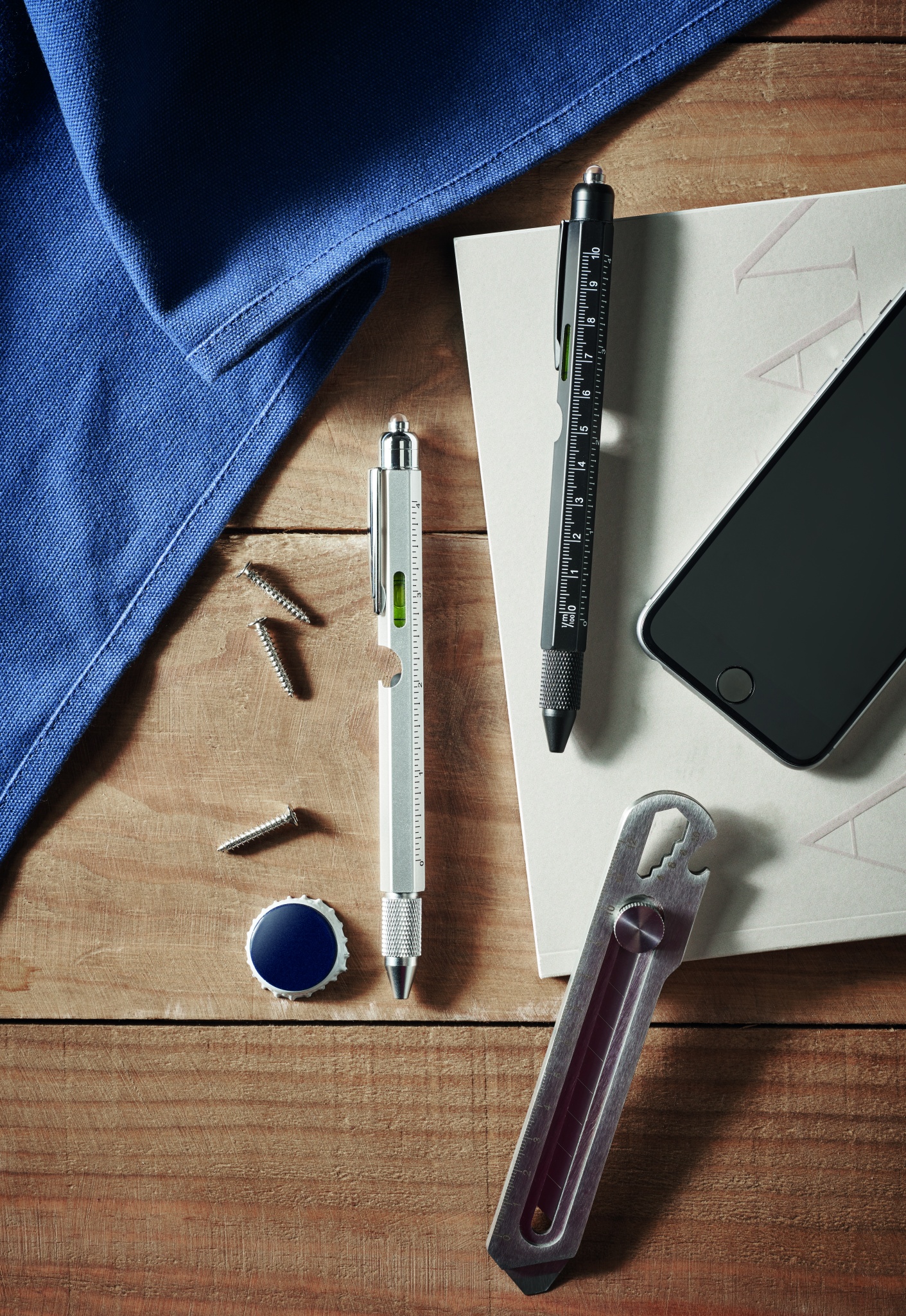 Поворотная шариковая ручка из нержавеющей стали с уровнем и линейкой. Есть также стилус, насадки для отверток с крестообразной и плоской головкой, фонарик. 3 батарейки AG в комплекте. Синие чернила.