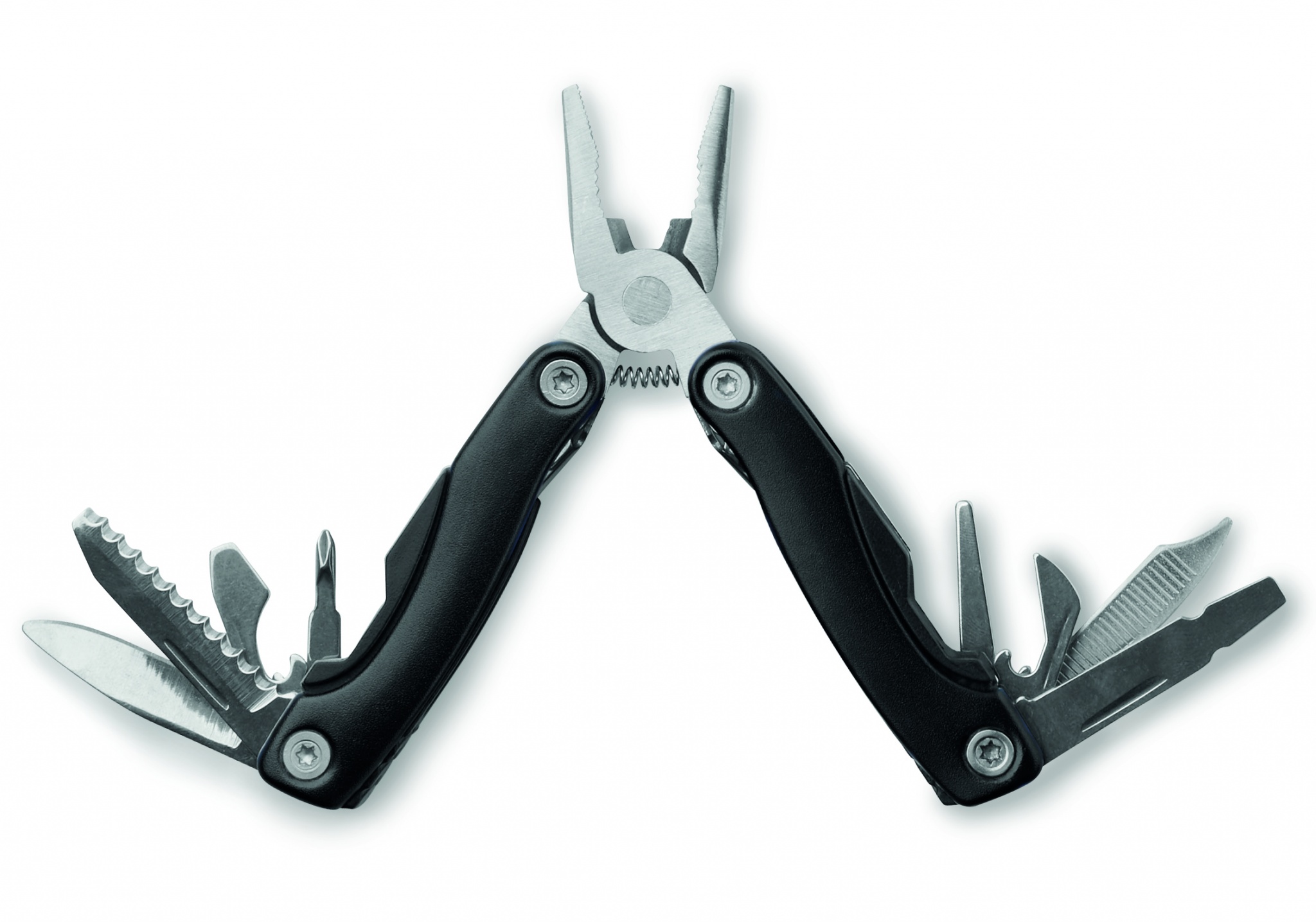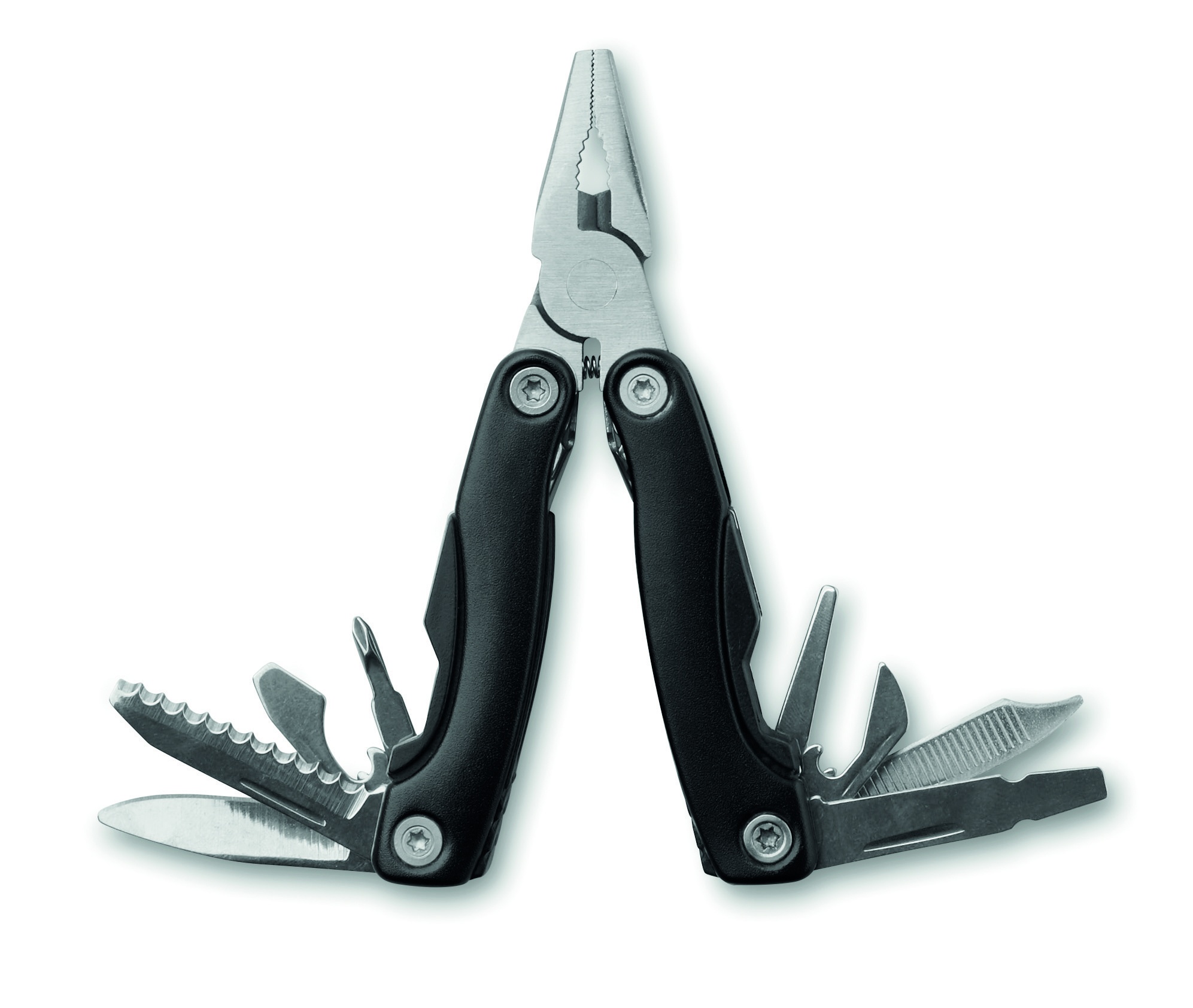 Складной многофункциональный инструмент из нержавеющей стали с рукояткой из пластика. 9 функций. Чехол из полиэстера.