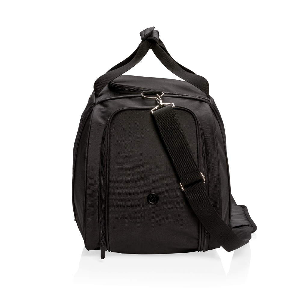 Эта дорожная сумка из полиэстера 600D с 1680D предлагает спортивный стиль для спортзала или обычных путешествий. Включает вместительное основное отделение с U-образной верхней застежкой-молнией, боковое отделение для обуви с вентиляционным отверстием и боковое отделение для бутылок. Передний карман на молнии для быстрого хранения смартфонов и других дорожных принадлежностей. Регулируемый плечевой ремень и двойные верхние ручки для удобства и универсальности переноски. Не содержит ПВХ.