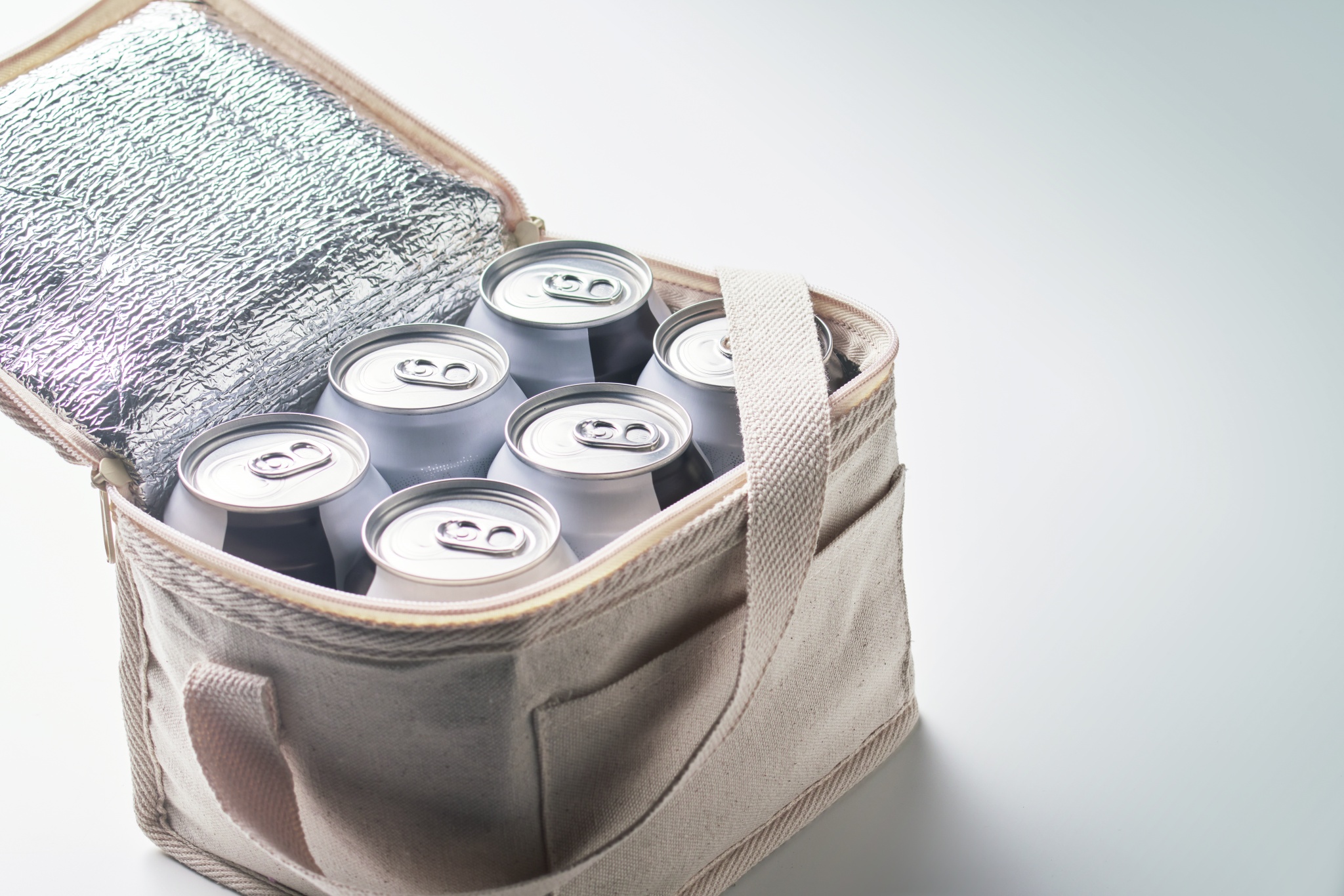 Сумка-холодильник из хлопка плотностью 280 г/м² с передним карманом. Внутри термоизоляционная алюминиевая фольга 3 мм. Вместимость: 3 л.
