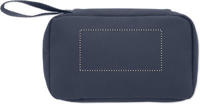 Toiletry bag in 600D RPET with PU coating, RPET mesh and 210D RPET lining. Features front zippered main compartment pocket, inner mesh and open pockets.