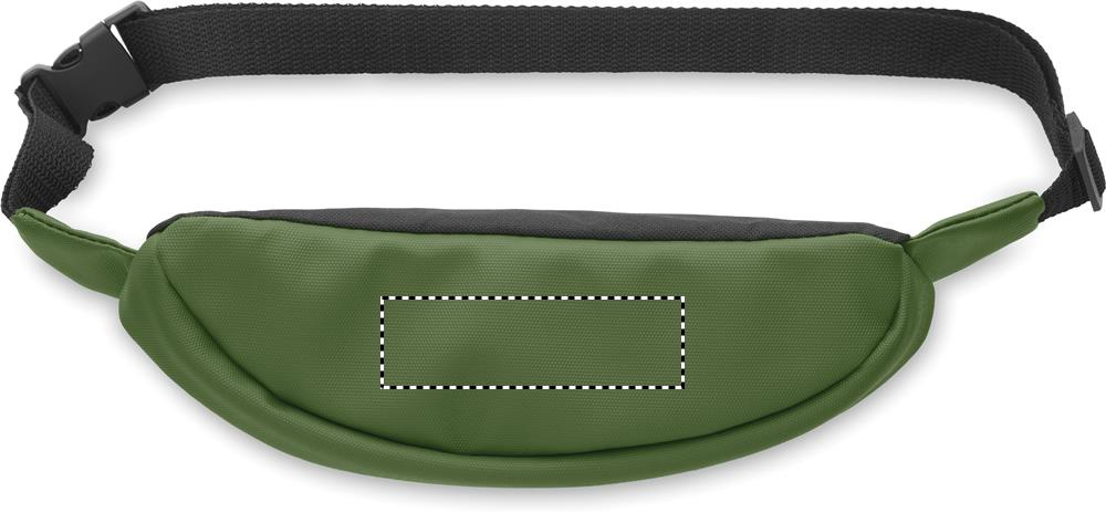 Waist bag with PU coated 600D RPET polyester, 210D RPET polyester lining and front zippered pocket.