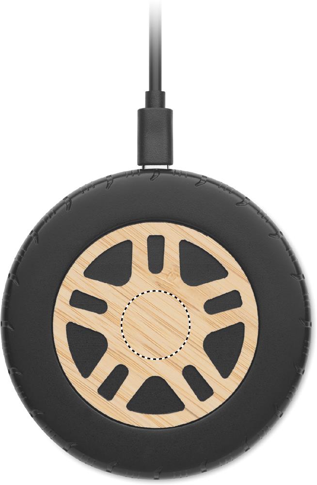 Беспроводное зарядное устройство мощностью 15 Вт из переработанного пластика с бамбуковым верхом. Дизайн в виде автомобильного колеса. Подключите устройство к компьютеру, положите на него смартфон и позвольте ему зарядиться. Выход: DC 9 В/1,10 А (15 Вт) для быстрой зарядки. Совместимость с последними моделями андроидов, iPhone® 12, X и новее.