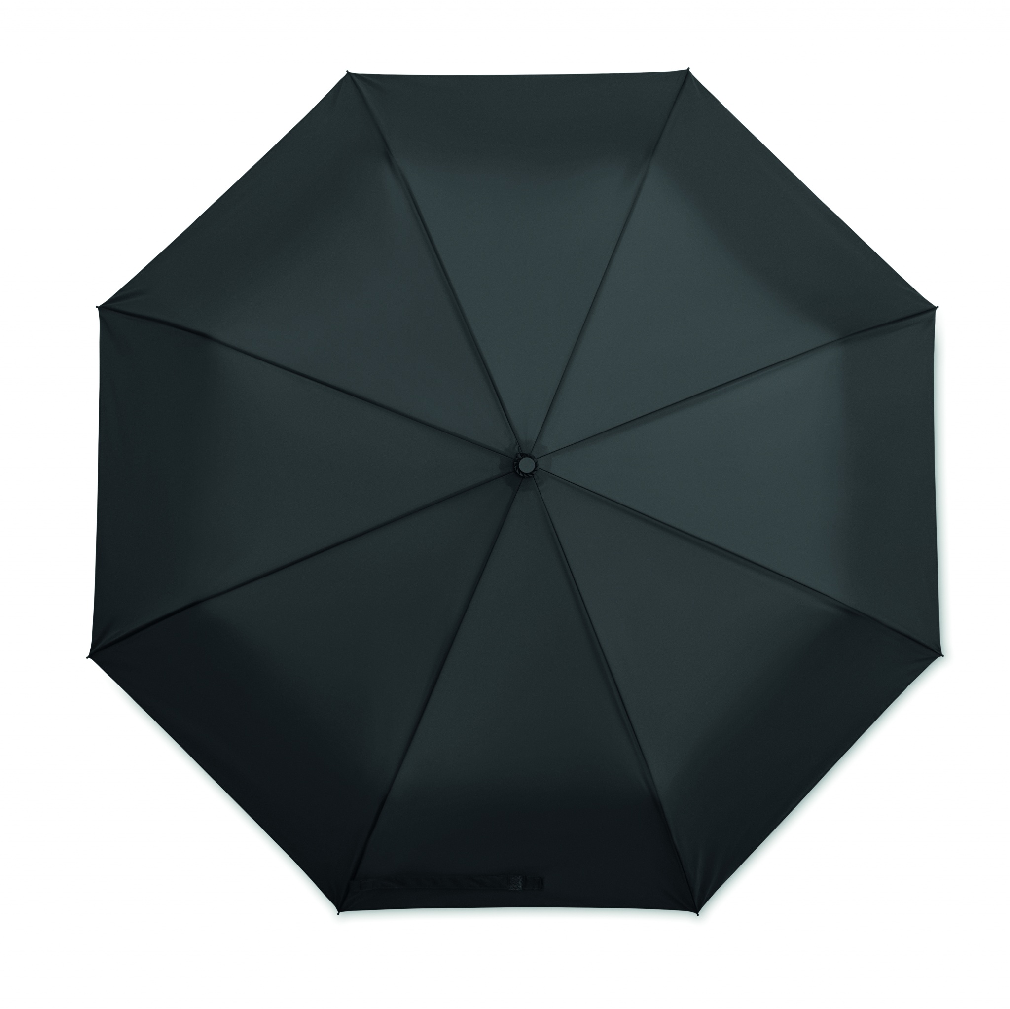 27-дюймовый ветроустойчивый зонт автомат в 3 сложения. Материал 190T эпонж, стальной стержень с черным покрытием. Спицы из стекловолокна. Черная полипропиленовая ручка с кнопкой. В комплекте с чехлом.